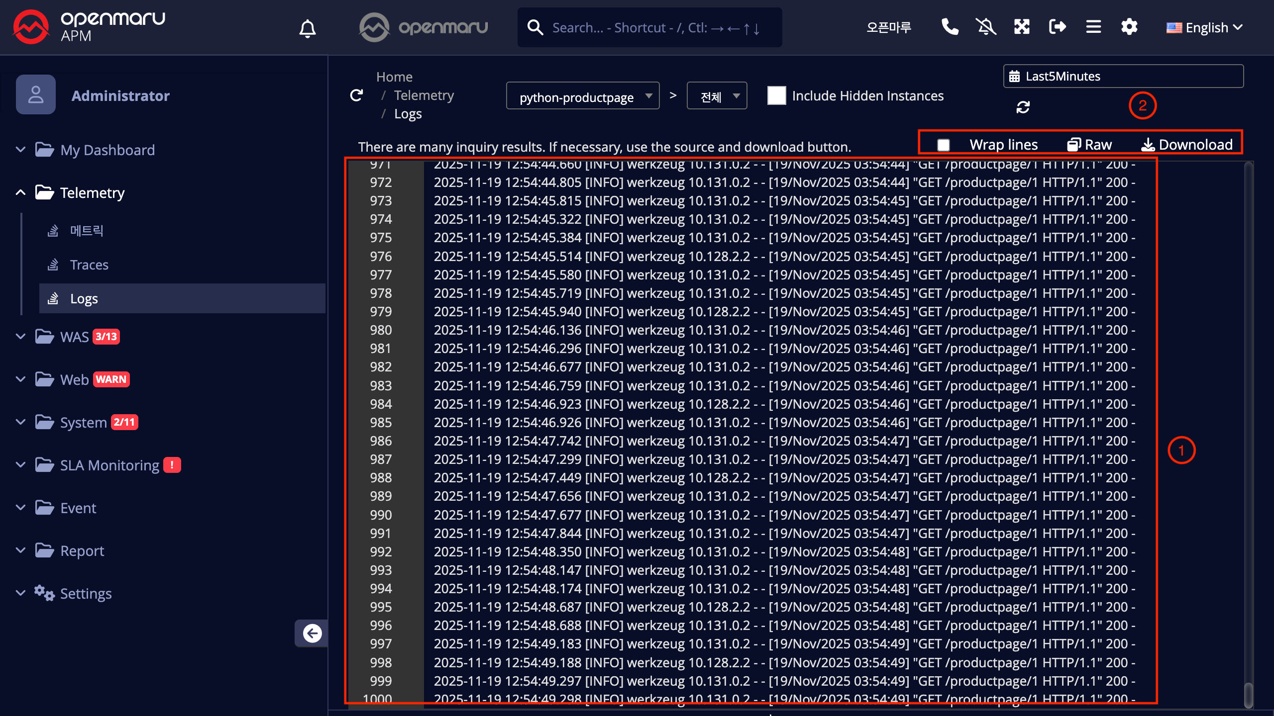 OPENMARU APM 은 Java, Node.js, Python, Golang 애플리케이션의 Telemetry 로그 정보를 확인 할 수 있습니다.