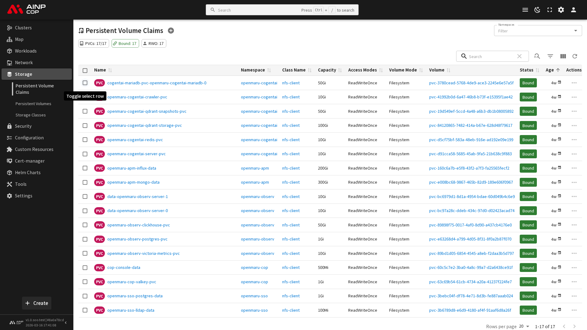 사이드바에서 스토리지 > 영구 볼륨 클레임을 선택하면 현재 네임스페이스의 PVC 목록이 표시됩니다. 목록에서는 다음 정보를 확인할 수 있습니다.