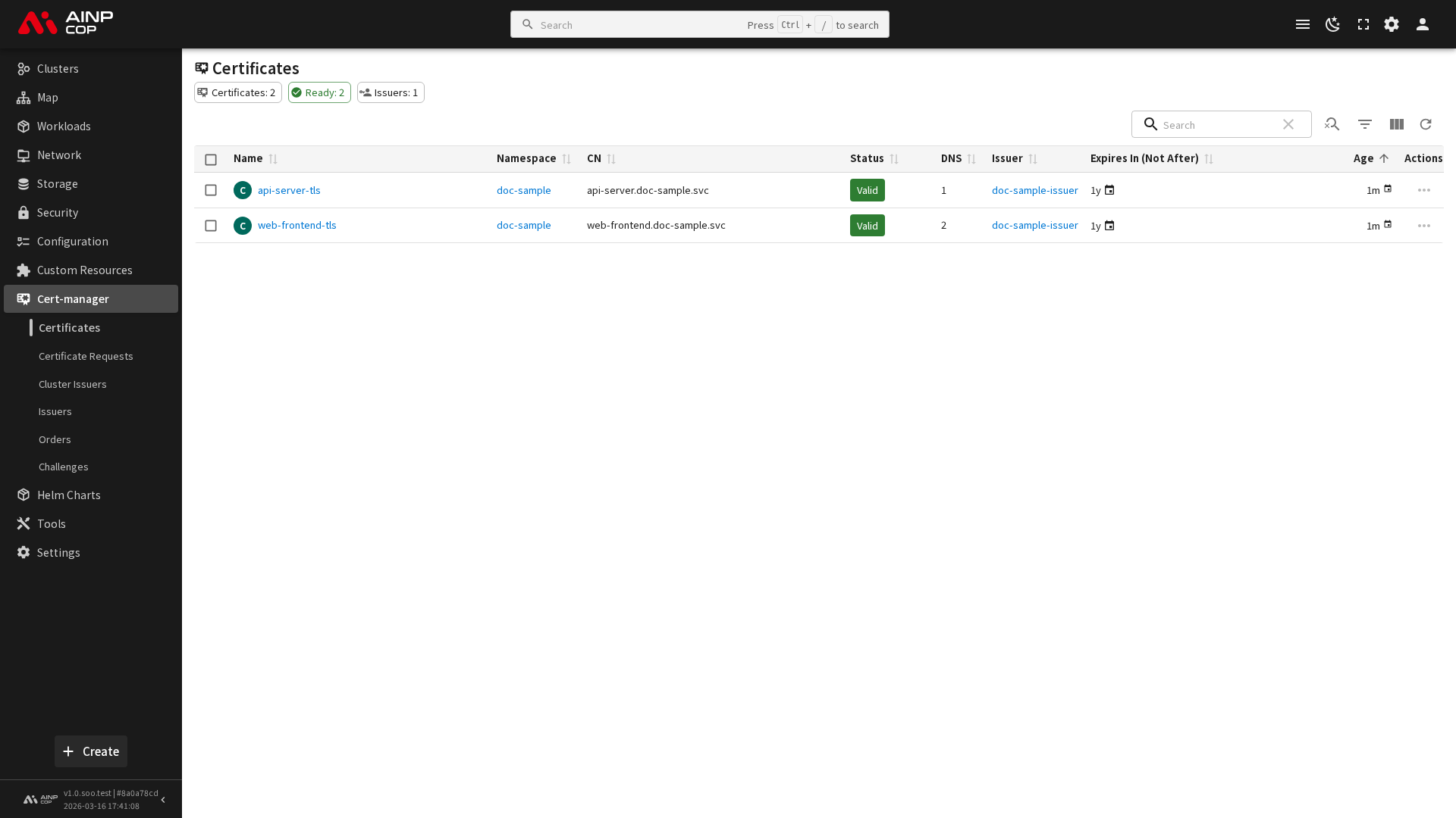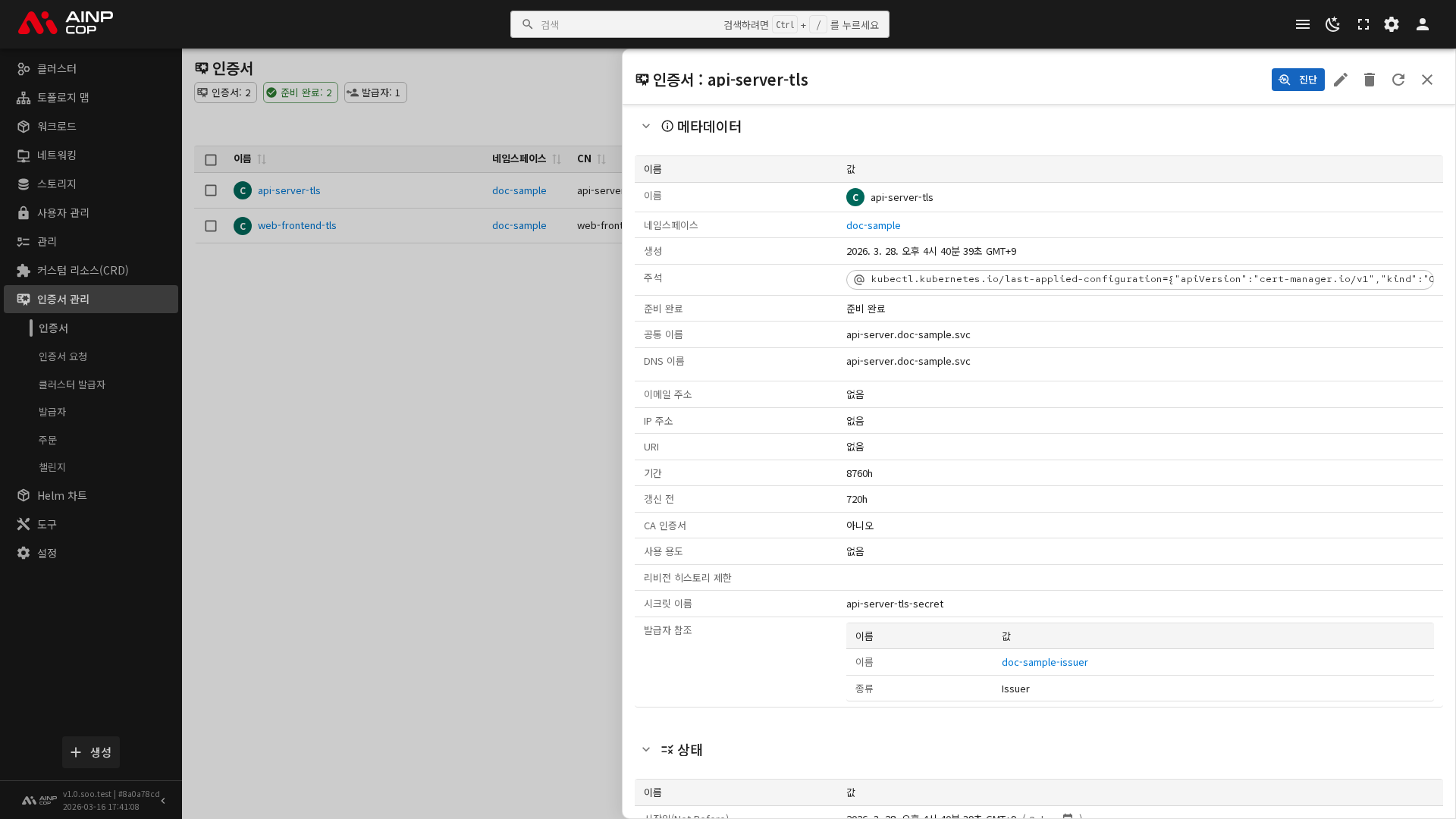 - 조건: 인증서의 현재 상태 조건 목록 (Ready, Issuing 등)