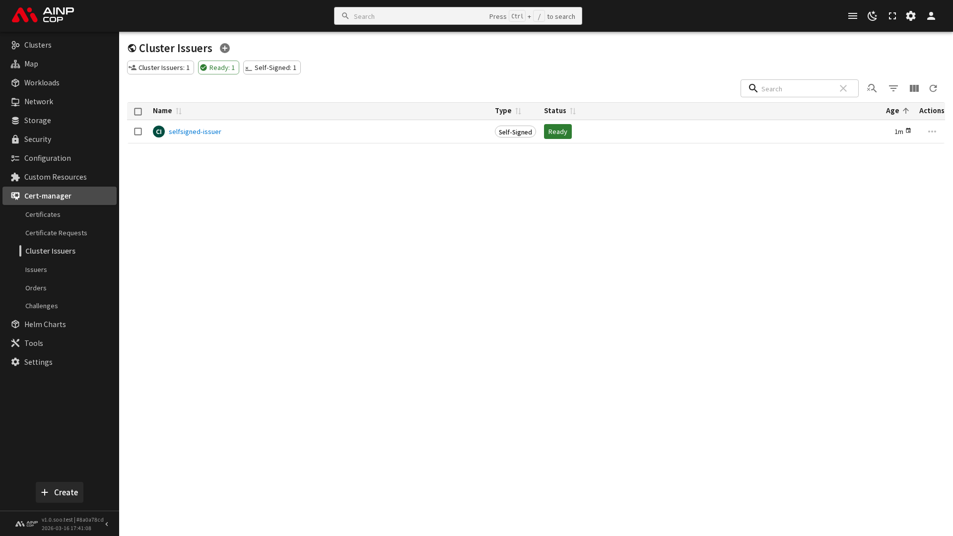 사이드바에서 인증서 관리 > ClusterIssuer를 선택하면 클러스터에 등록된 ClusterIssuer 목록이 표시됩니다. 목록에서는 다음 정보를 확인할 수 있습니다.