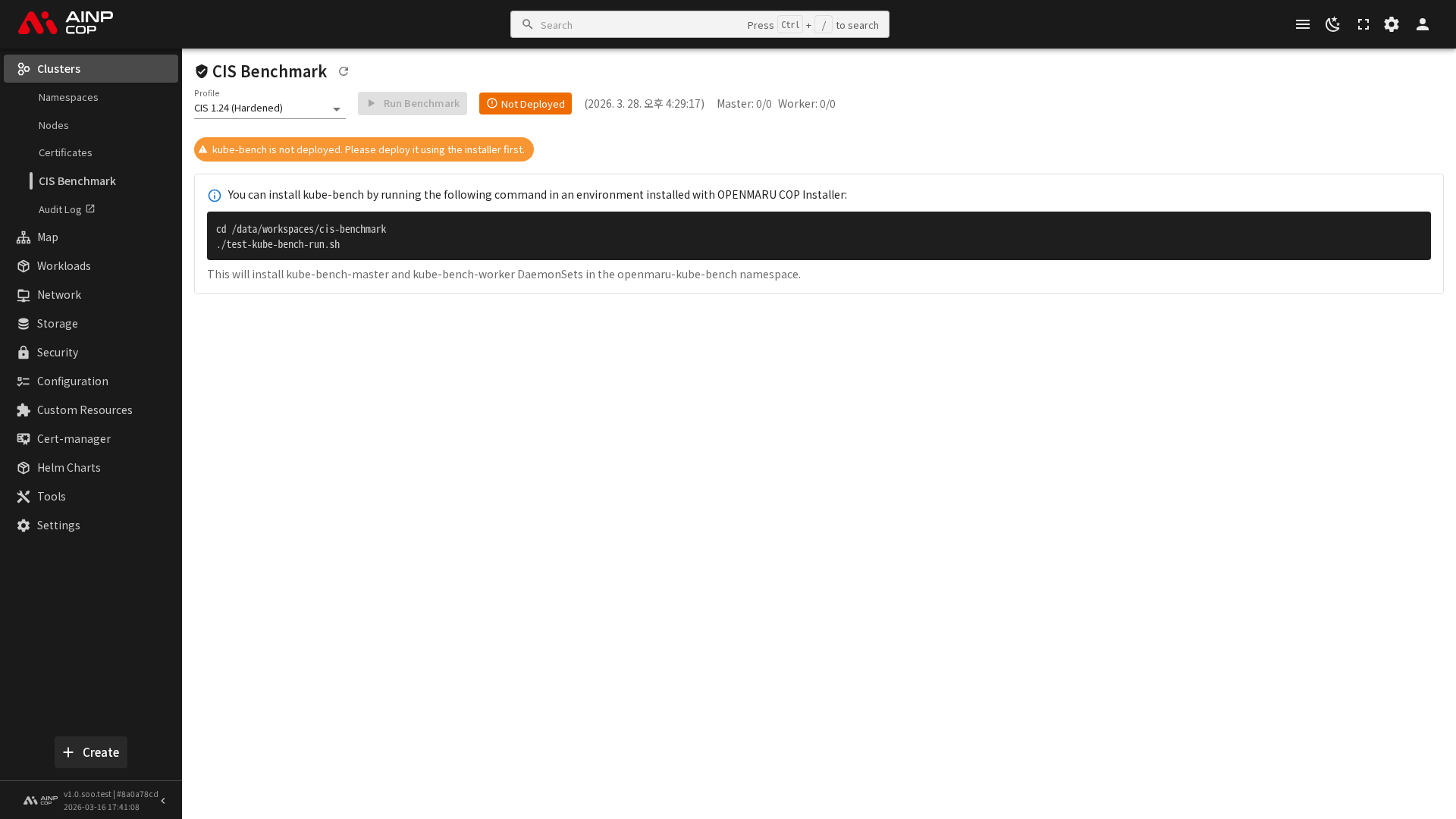 사이드바에서 클러스터 > CIS Benchmark를 선택하면 kube-bench 결과 페이지로 이동합니다.