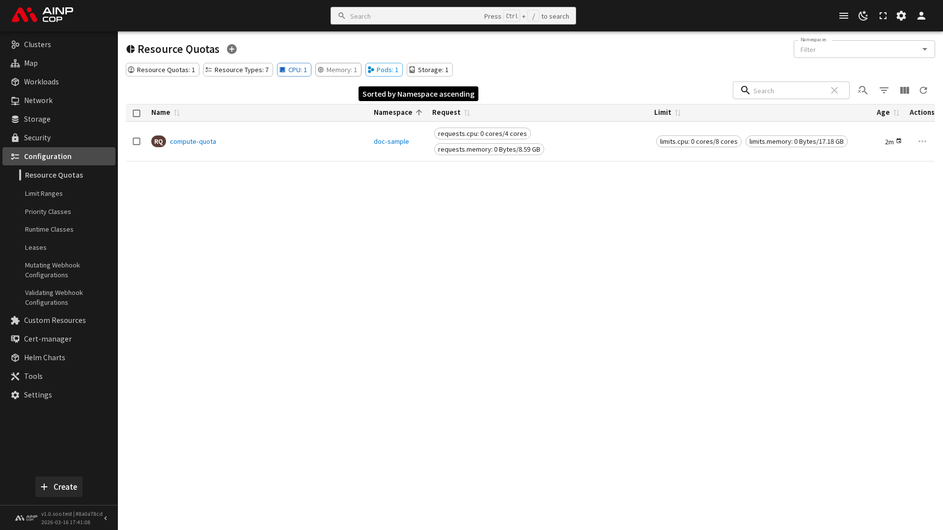 사이드바에서 설정 > 리소스 할당량을 선택하면 현재 네임스페이스의 할당량 목록이 표시됩니다. 각 항목에 대해 이름과 네임스페이스를 확인할 수 있습니다.