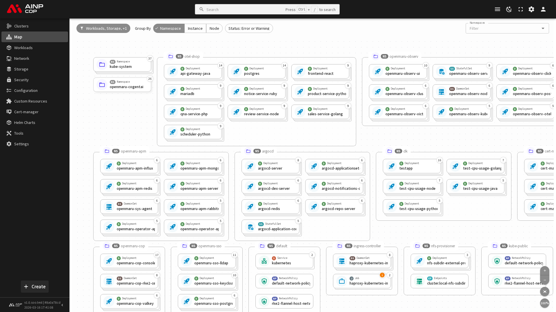 COP 콘솔의 '리소스 맵' 기능은 Kubernetes 클러스터 내 리소스 간의 관계를 그래프 형태로 시각화하여 보여줍니다. 이를 통해 사용자는 클러스터 내의 애플리케이션 및 인프라 구성 요소를 한눈에 파악하고, 문제 발생 시 관련 리소스를 신속하게 식별할 수 있습니다.