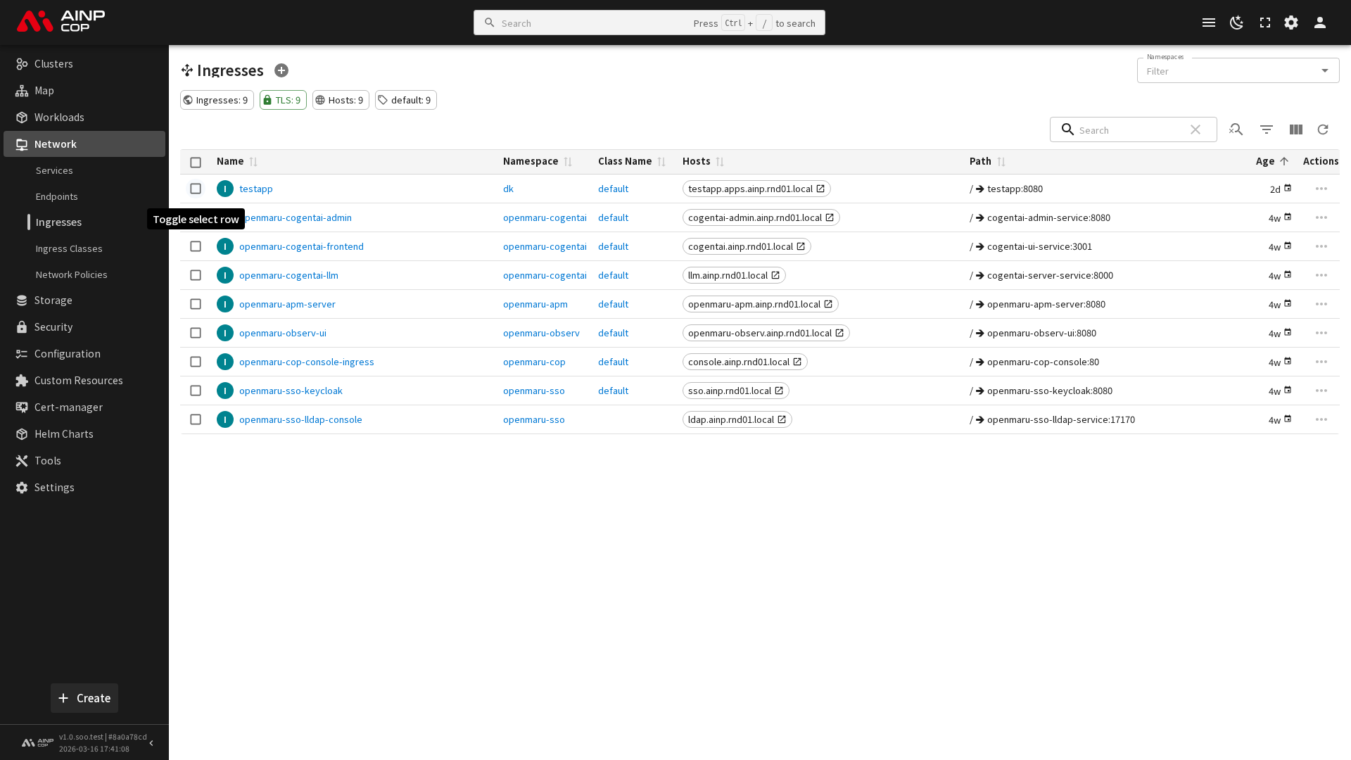 사이드바에서 네트워크 > 인그레스를 선택하면 인그레스 목록이 표시됩니다. 목록에서는 다음 정보를 확인할 수 있습니다.