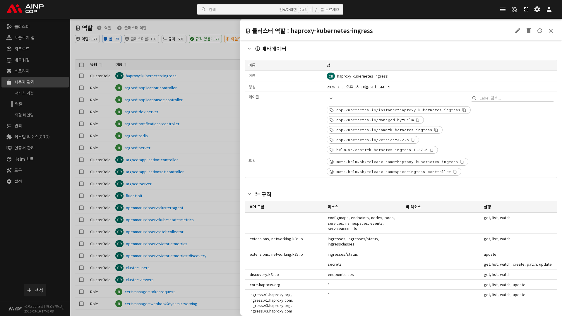 사이드바에서 보안 > 역할을 선택하면 현재 네임스페이스의 Role 목록이, 보안 > 클러스터 역할을 선택하면 클러스터 범위의 ClusterRole 목록이 표시됩니다.