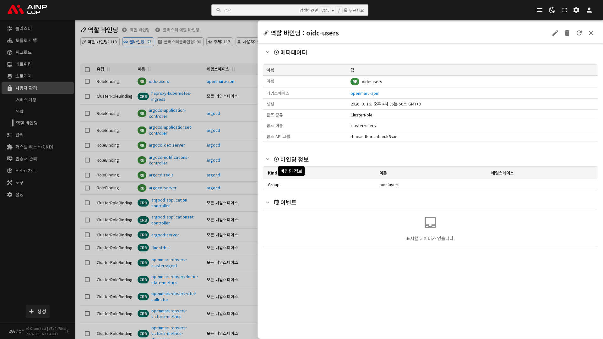 역할 바인딩 상세 화면에서는 주체(Subject)와 역할(Role)의 연결 관계를 확인할 수 있습니다.