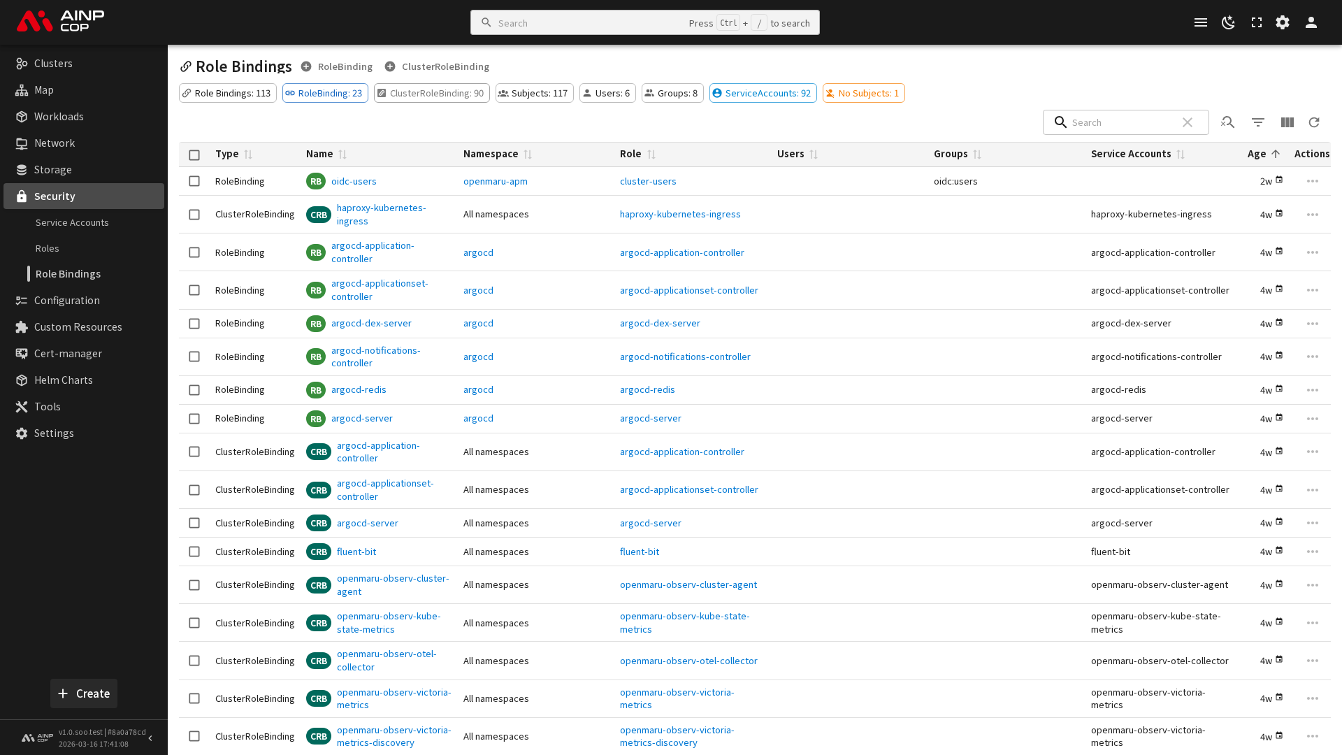 사이드바에서 보안 > 역할 바인딩을 선택하면 현재 네임스페이스의 RoleBinding 목록이, 보안 > 클러스터 역할 바인딩을 선택하면 ClusterRoleBinding 목록이 표시됩니다.