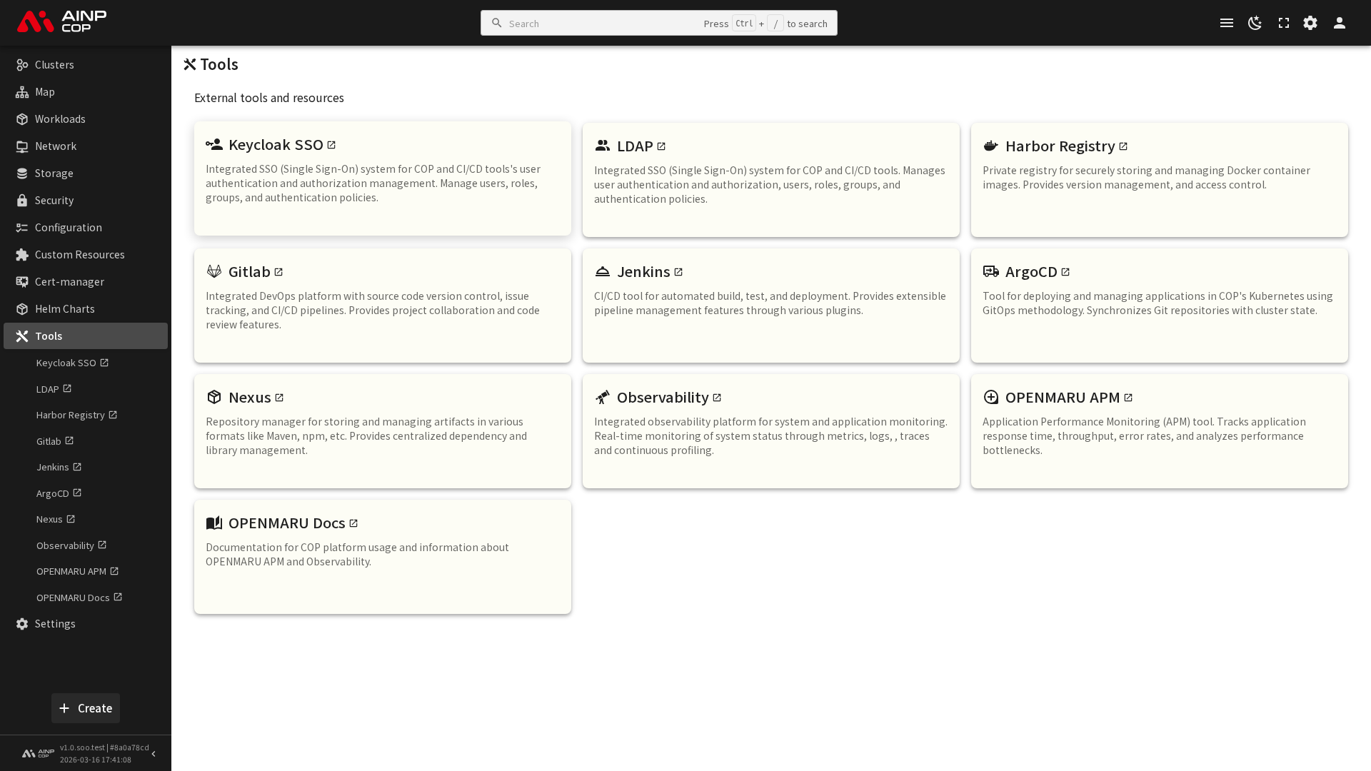 COP Console의 도구(Tools) 메뉴는 외부 도구 및 리소스에 대한 빠른 접근을 제공합니다. DevOps 파이프라인에서 사용하는 다양한 플랫폼(GitLab, Jenkins, Harbor, ArgoCD 등)의 웹 UI로 Console에서 바로 이동할 수 있습니다.