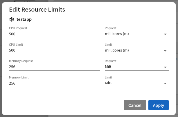 동작 메뉴의 편집 또는 상세 화면에서 컨테이너의 CPU 및 메모리 리소스 요청(Request)과 제한(Limit)을 설정할 수 있습니다.