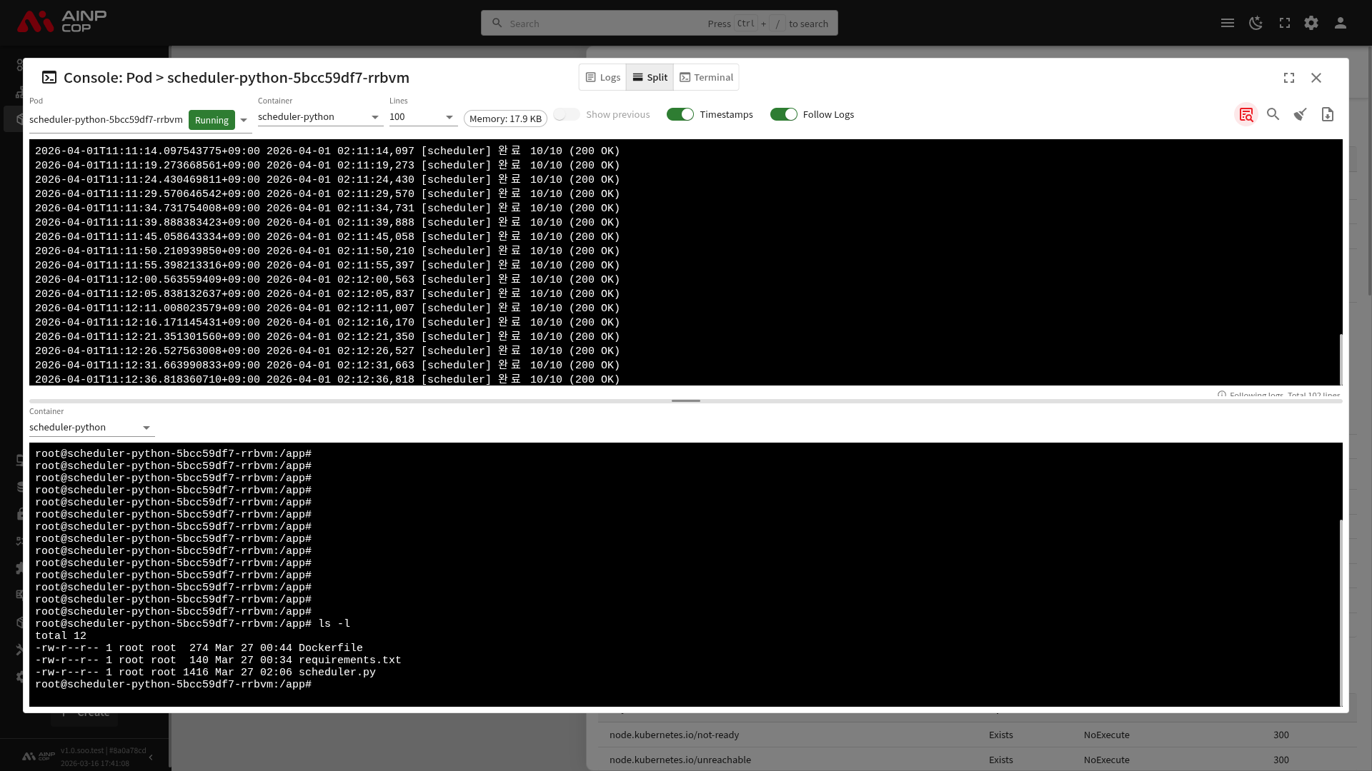 배포 상세 화면에서 파드의 로그 조회와 터미널 접속을 동시에 활용할 수 있습니다. 로그와 터미널을 각각 단독으로 볼 수도 있고, 화면을 분할하여 함께 확인할 수도 있습니다.