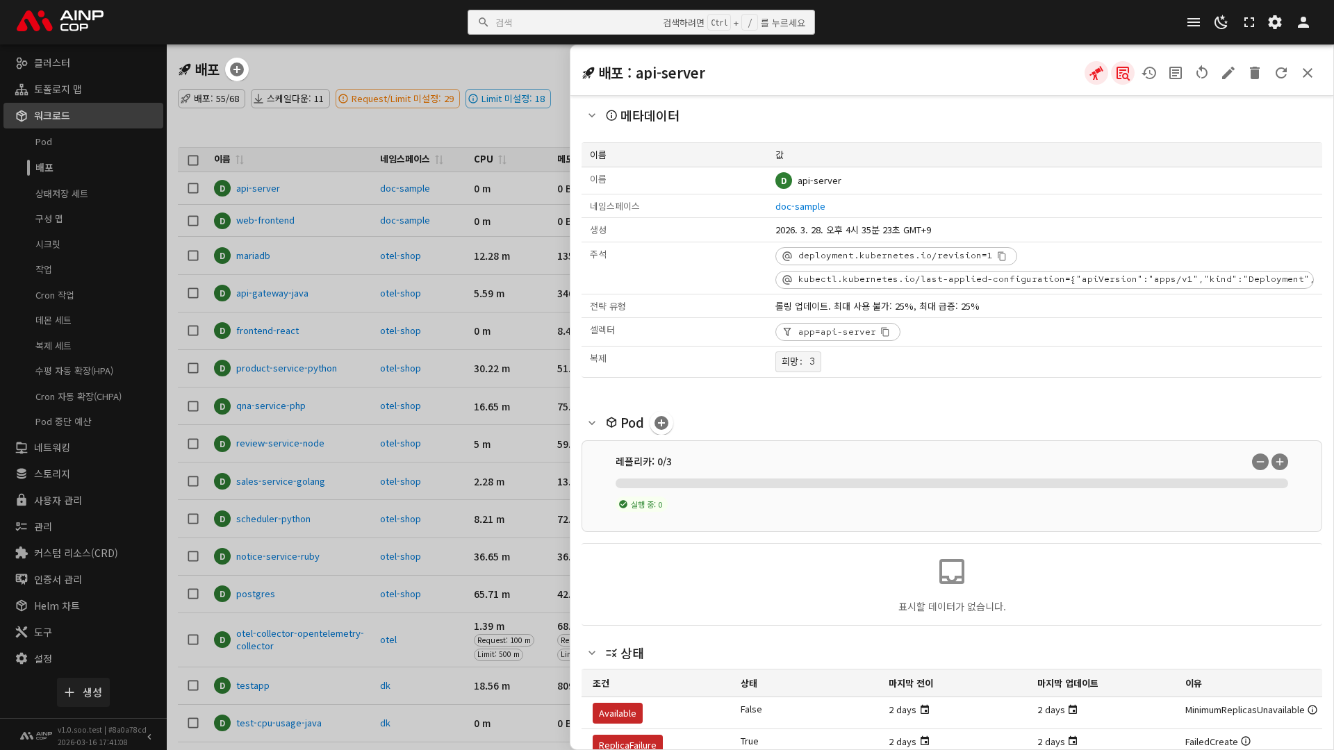 배포가 관리하는 ReplicaSet, Pod 등 관련 리소스의 목록을 확인하고 각 리소스의 상세 화면으로 이동할 수 있습니다.