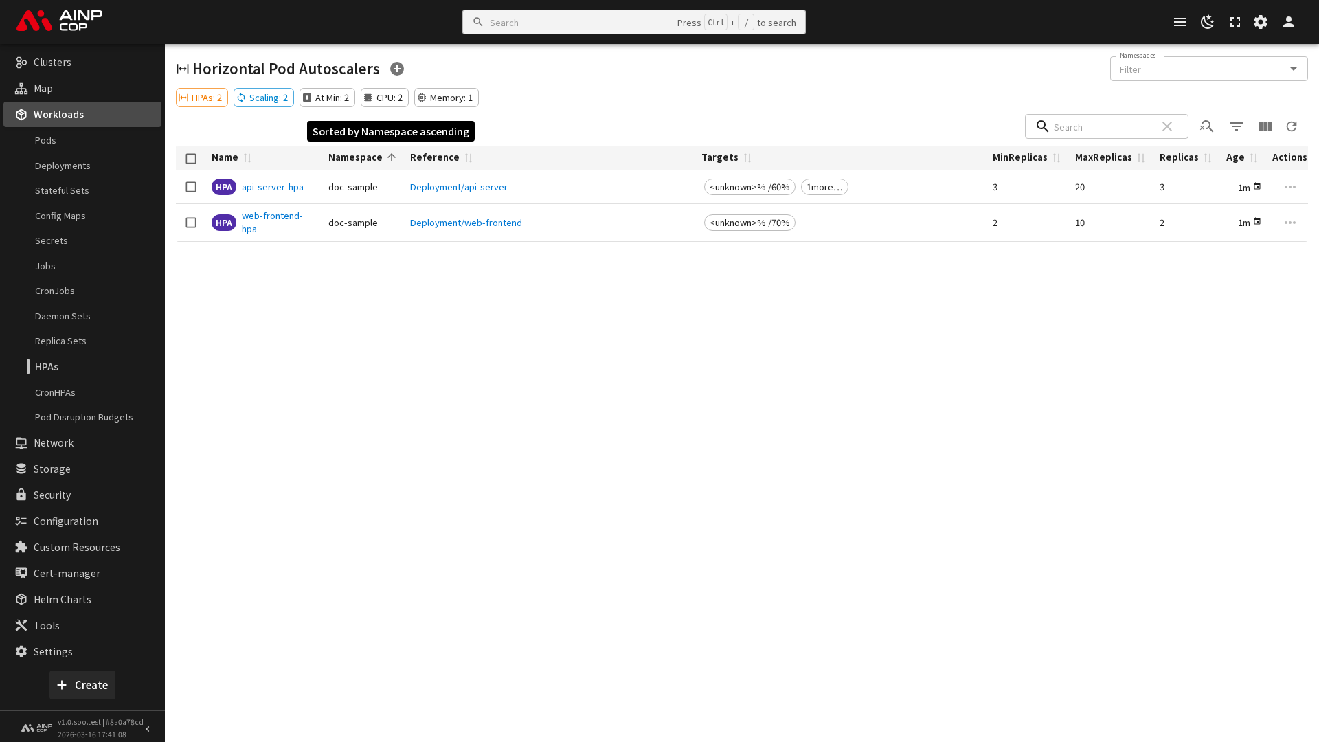 클러스터에 설정된 HPA의 정보가 목록 형태로 표시됩니다.