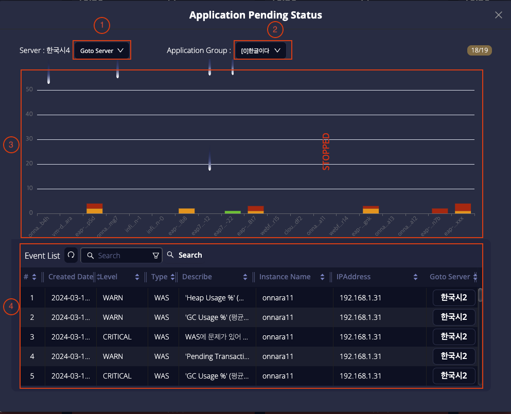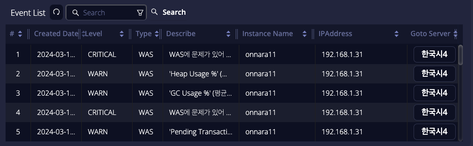 모든 종류의 대시보드의 우측 하단에서 볼수 있는 테이블로 “이벤트 목록” 버튼을 클릭하면 활성화된다. OPENMARU APM 에서 모니터링되는 이벤트를 레벨별, 유형별로 확인 할 수 있으며 우측의 서버이동 버튼으로 해당 이벤트와 연관된 OPENMARU APM 메뉴로 바로 이동하여 이벤트가 발생한 원인을 확인할 수 있습니다.