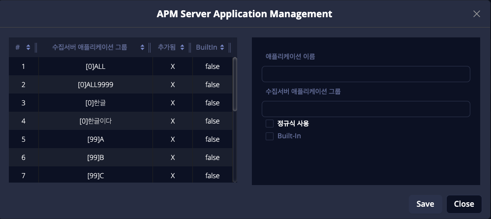 - 정규식 사용을 체크한 후 APM서버 애플리케이션 그륩에서 정규식을 입력할 수 있다.