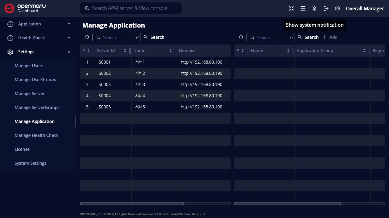 서버관리에 등록한 서버에 애플리케이션을 등록하고 관리하는 기능을 제공합니다.