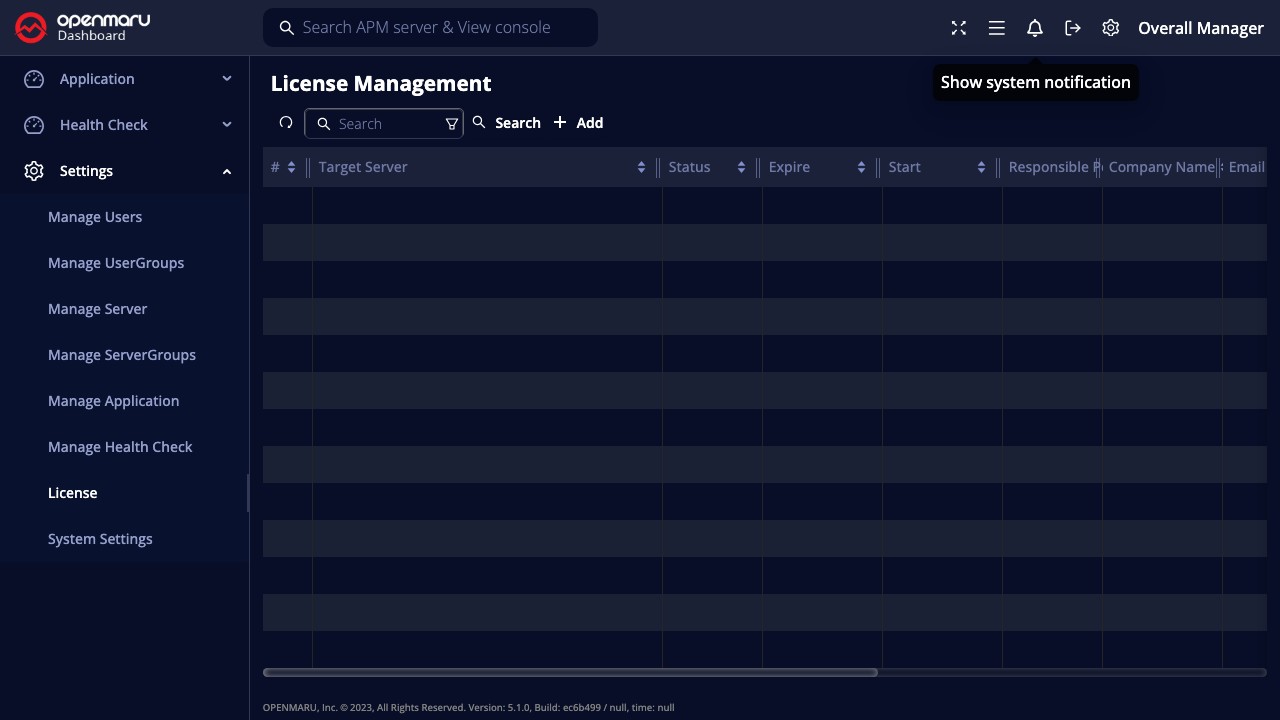 OPENMARU DashboardDashboard 설정가이드라이센스 관리On this page라이센스 관리 오픈마루 대시보드의 라이센스를 등록하고 관리하는 기능을 제공합니다. 라이센스 관리란? 대시보드 라이센스를 등록하고 삭제할 수 있는 관리 페이지이다. 라이센스 등록 추가 버튼을 클릭하면 라이센스를 등록이 가능하다.