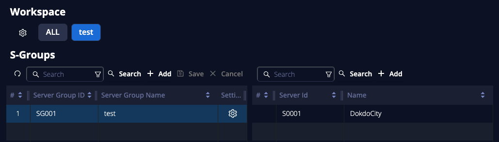 왼쪽 테이블은 서버그룹 리스트, 오른쪽 테이블은 서버그룹에 등록된 서버 리스트이다.