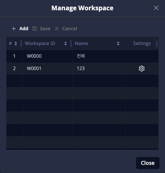 이 창을 통해서 워크스페이스를 등록, 수정, 삭제가 가능하다.