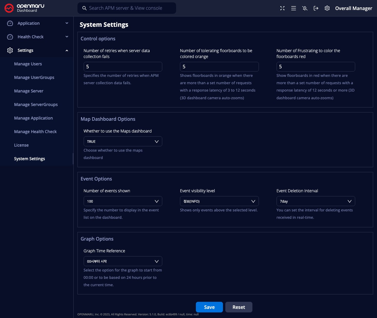 오픈마루 대시보드의 주요 기능을 설정할 수 있습니다.