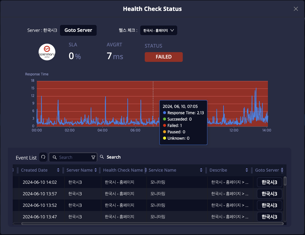 OPENMARU APM 의 해당 헬스체크의 SLA 보고서 메뉴에 이동 할 수 있는 기능이다. 헬스체크 상태가 빨간색으로 표시되면 그 원인을 확인하여 조치하여야 한다. OPENMARU APM에서는 다양한 에러원인 분석도구를 제공하고 있다.
