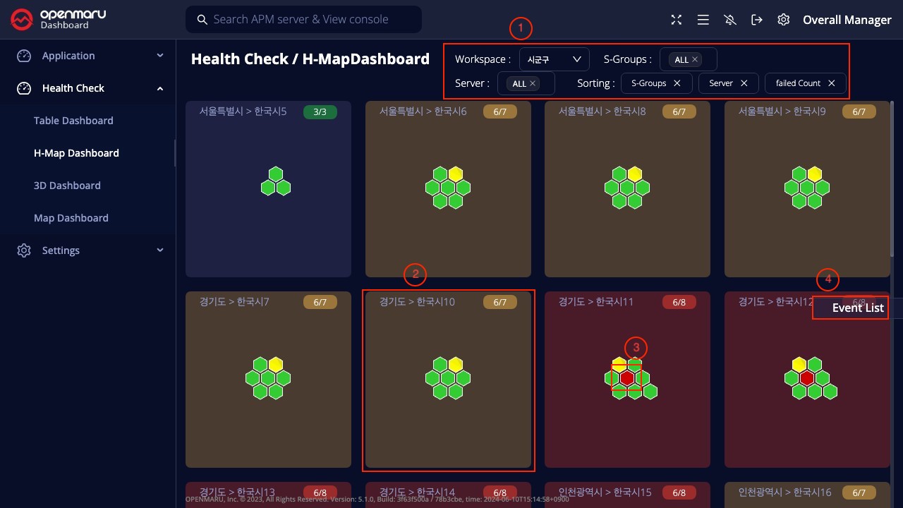 헬스체크에서 감지된 에러 상태에 따라 네이비, 노랑, 빨간색으로 표시하는 육각형(Hexagon) 벌집 형태로 실시간 모니터링합니다
