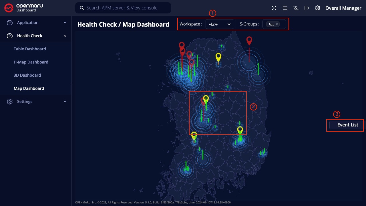 설정 > 헬스체크관 리 > 헬스체크 수정시 ‘시/도’ 항목에서 선택된 지역에 등록된 헬스체크가 지도 대시보드에 표시되며, 기둥의 색상은 헬스체크의 상태를, 기둥의 길이는 응답시간을 표현합니다.