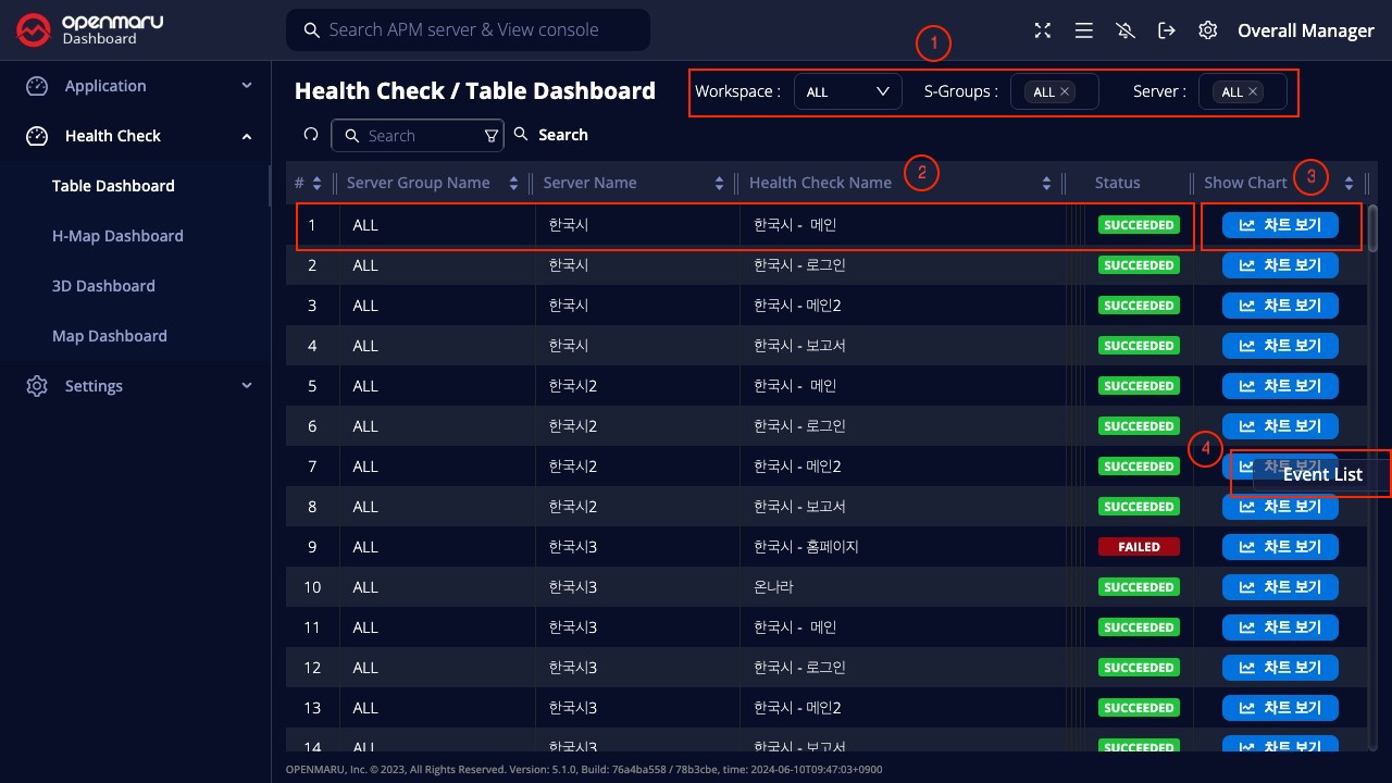 대시보드의 우측 하단의 “이벤트 목록” 버튼을 클릭하여 확인 할 수 있으며, OPENMARU APM 서버에서 발생한 헬스체크 관련 이벤트를 목록으로 확인 할 수 있습니다.