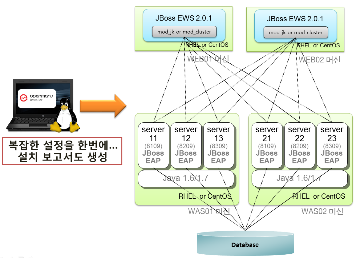 OPENMARU Installer 은 OPENMARU APM, JBoss EAP(Enterprise Application Platform), JBoss EWS(Enterprise Web Server), JBoss JWS(JBoss Web Server), JBoss DataGrid 제품을 자동으로 설치하는 프로그램입니다. JBoss를 사용하는 대부분의 기업 환경에서 설치하는 표준 가이드에 따라 자동으로 설치되기 때문에, 단 몇 십분이면 JBoss EWS, EAP또는 Apache HTTPD, Apache Tomcat이 자동으로 설치되고, 설치를 확인할 테스트 애플리케이션까지 배포됩니다. 또, 고객에게 제공할 설치 보고서, 운영가이드 문서들 생성되기 때문에 생성된 문서를 고객에게 제공하면 됩니다. 엔지니어는 빠른 시간에 설치 작업을 완벽히 마칠 수 있게 됩니다.
