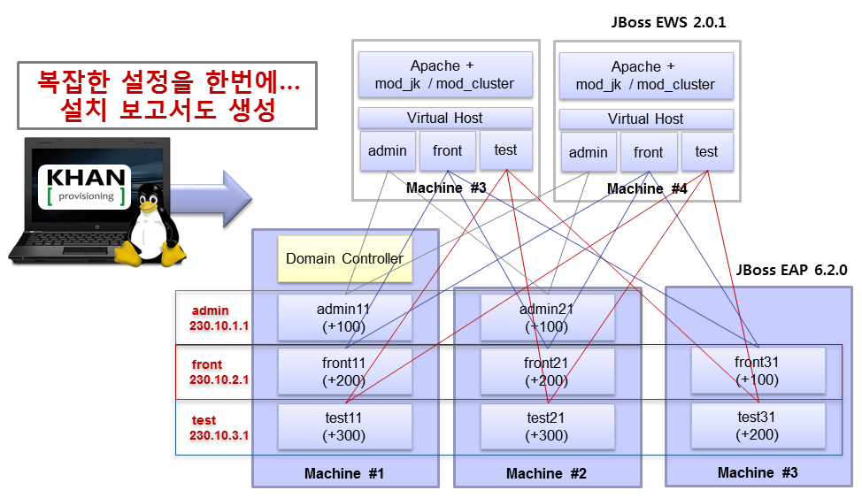 [jboss-eap] 항목은 서버 IP machine_id, is_eap_first_server를 지정한다. machine_id는 EAP서버 인스턴스의 이름을 생성할 때 사용되는 머신의 번호를 설정한다. JBoss EAP 서버 인스턴스 이름을 생성할 때는 server11, server12, server21, server22와 같이 생성하게 되는데, 이때 두자리 숫자중 첫번째 숫자가 머신의 번호, 두번째 숫자는 인스턴스의 번호로 사용한다. 이렇게 설정하면 모든 인스턴스 이름만으로도 어떤 서버의 어떤 인스턴스인지 곧바로 판단할 수 있기 때문에 이런 방식의 인스턴스 Naming을 사용한다.