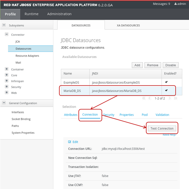 항목 설정 값 Connection URL jdbc:mysql://locahost:3306/test Username root Password password Security Domain (공백) Connection 설정 부분은 아래의 그림과 같습니다.