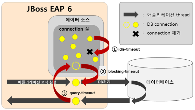 데이터베이스와의 연결 관리는 클라이언트 애플리케이션이 아닌 JBoss EAP 6에서 하게 된다. 비교적 비용이 많이 소요되는 데이터베이스와의 연결도 풀 형태로 관리하여 데이터베이스 연결에 대한 부하를 최소화한다.
