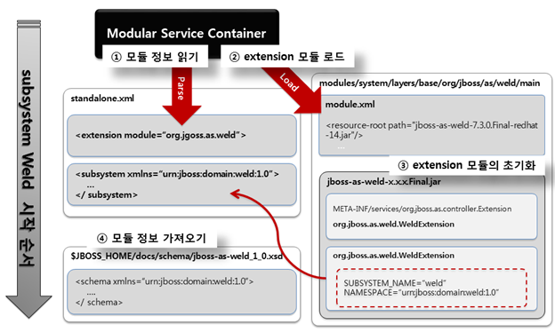 JBoss EAP 6에서는 JBoss 모듈 서비스 컨테이너(이하, MSC)가 적용되어 애플리케이션 서버의 서브시스템(EJB, 서블릿, JNDI 바인딩 등)의 각 모듈로부터 사용자 애플리케이션까지 MSC 상에서 동작하는 모듈 서비스로 구성하고 있다.