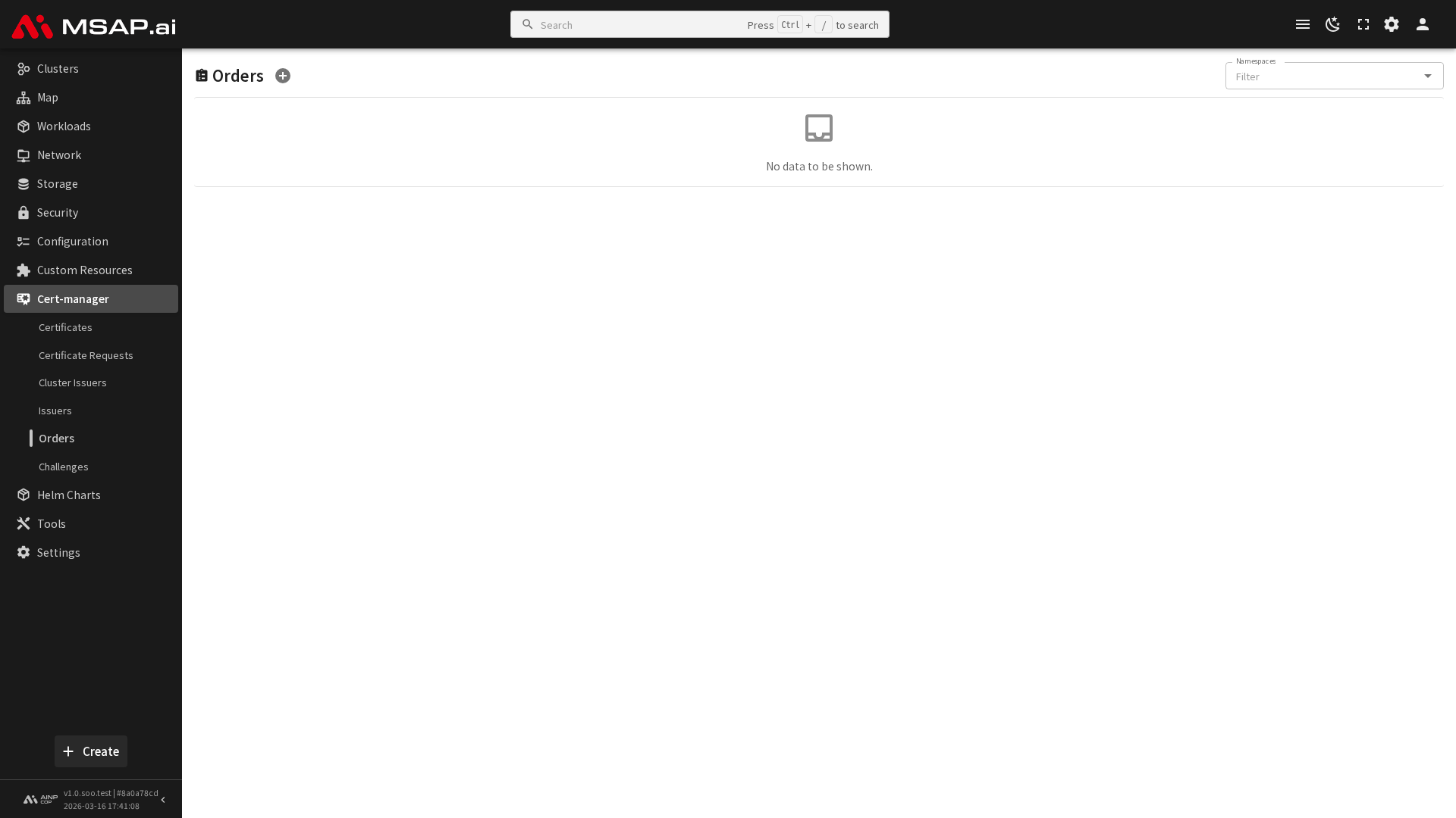 사이드바에서 인증서 관리 > Order를 선택하면 현재 클러스터에 존재하는 Order 목록이 표시됩니다. 목록에서는 다음 정보를 확인할 수 있습니다.
