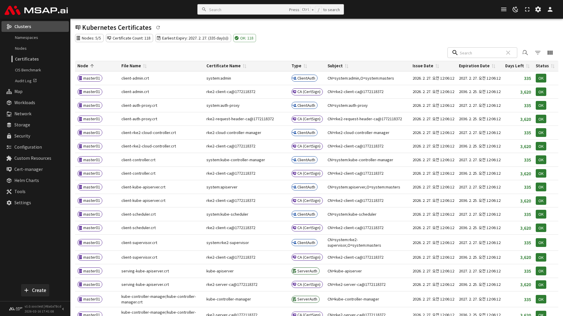 Kubernetes 클러스터 내부 통신에 사용되는 인증서의 상태를 확인할 수 있습니다.
