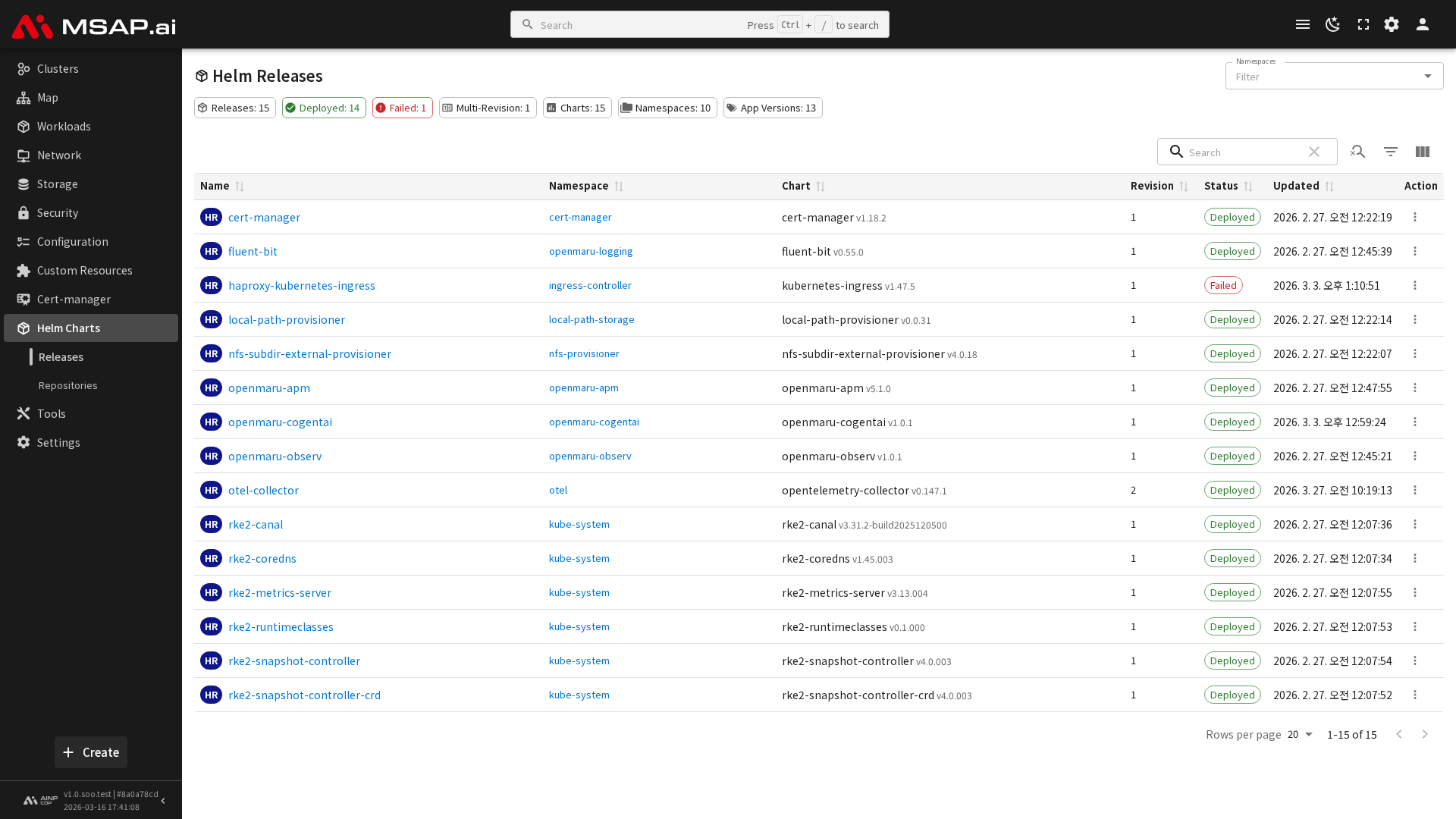 MSAP.ai 사용자 가이드Helm 차트릴리즈On this page릴리즈 Helm Release는 Helm 차트를 통해 클러스터에 설치된 애플리케이션 인스턴스입니다. MSAP.ai Console에서는 설치된 릴리스의 상태를 확인하고 관리할 수 있습니다. 릴리스 목록