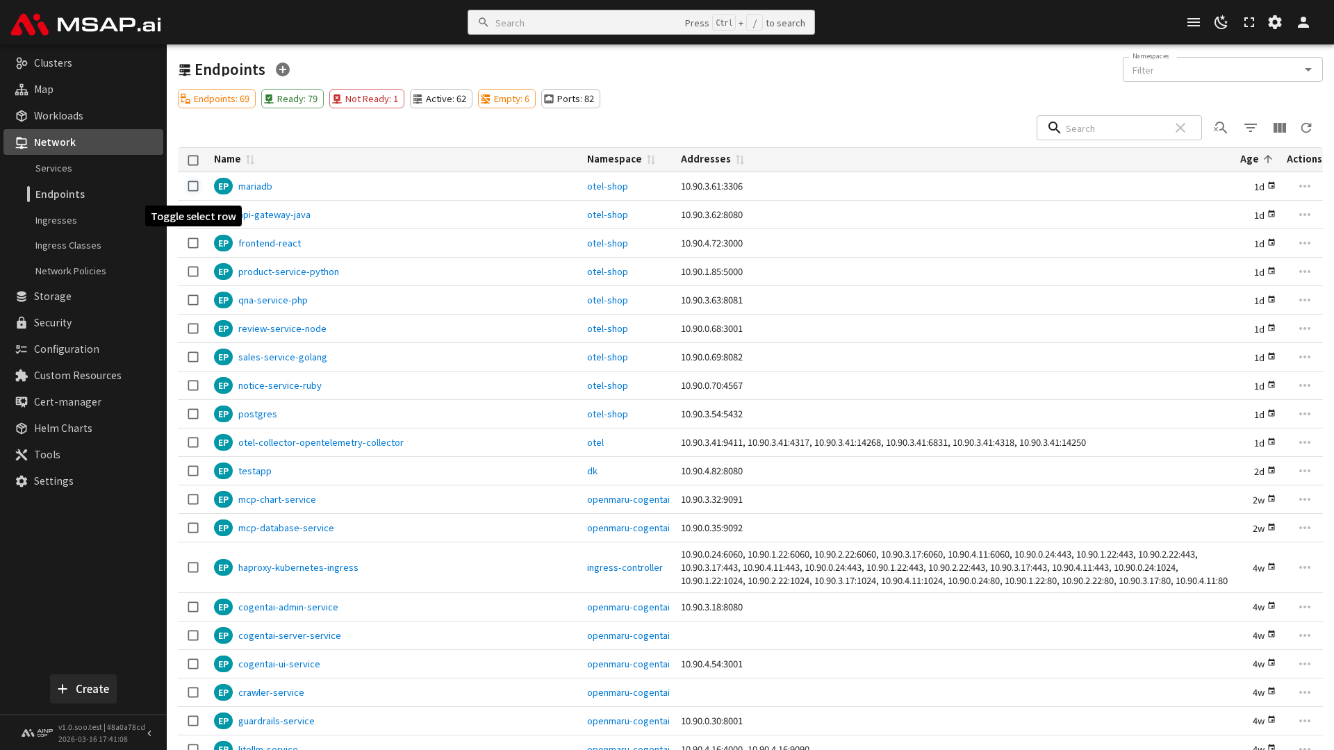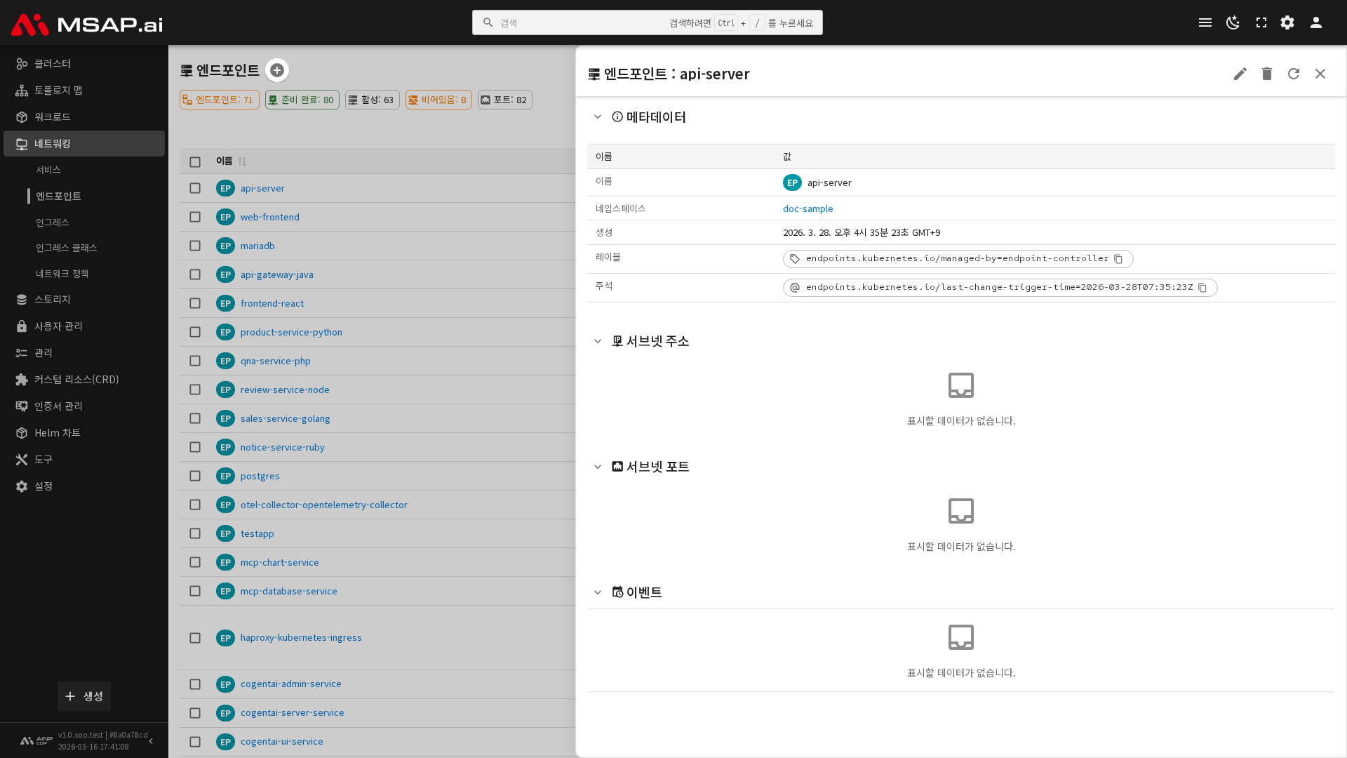 사이드바에서 네트워크 > 엔드포인트를 선택하면 현재 네임스페이스의 엔드포인트 목록이 표시됩니다. 각 엔드포인트에 대해 이름, 네임스페이스, 연결된 주소 수 등을 확인할 수 있습니다.