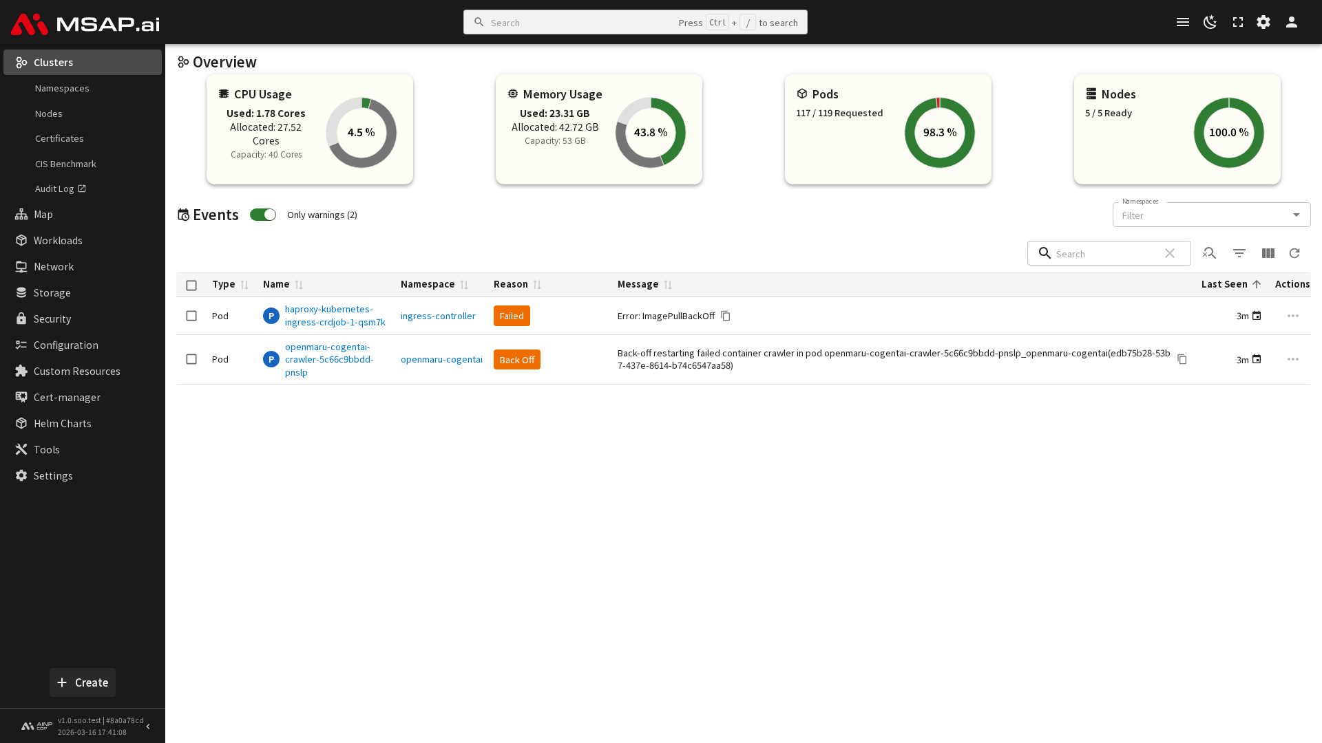 클러스터에서 발생한 주요 이벤트와 알림을 확인할 수 있습니다.