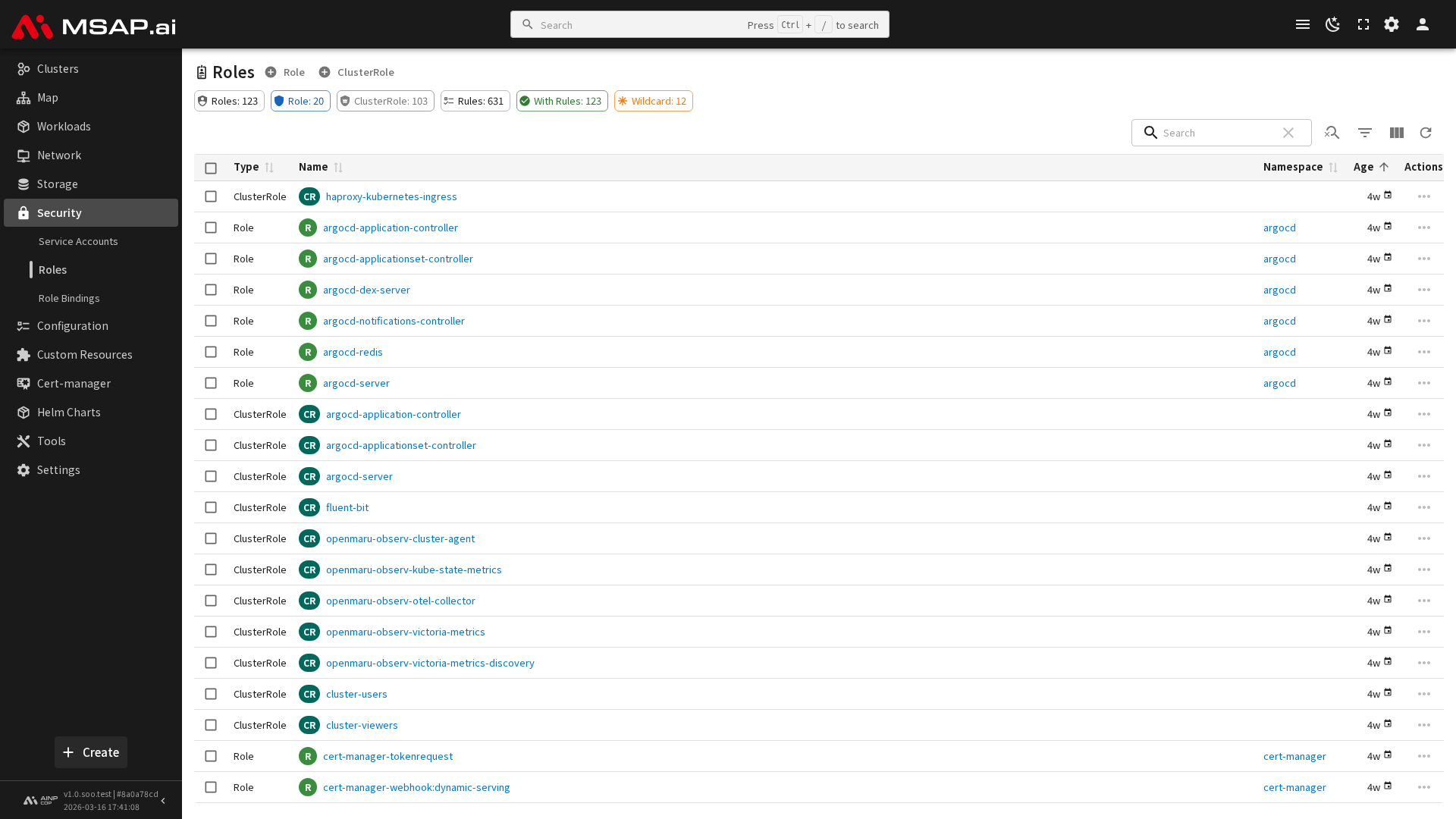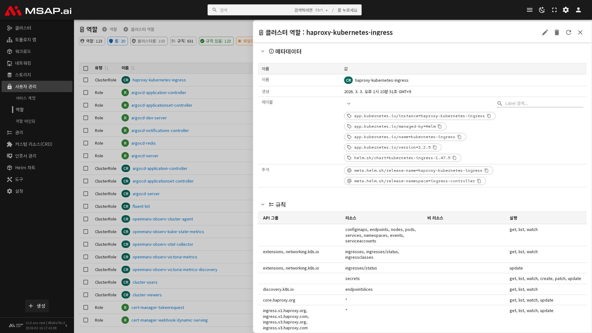 사이드바에서 보안 > 역할을 선택하면 현재 네임스페이스의 Role 목록이, 보안 > 클러스터 역할을 선택하면 클러스터 범위의 ClusterRole 목록이 표시됩니다.