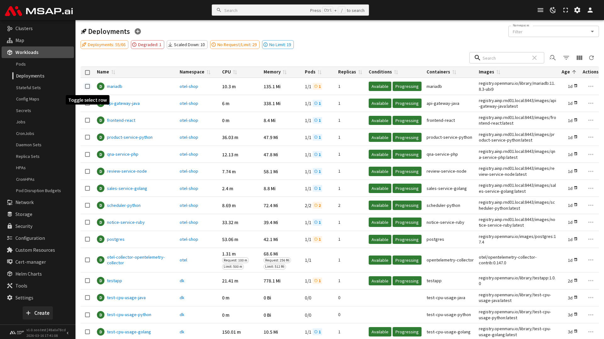 CPU 또는 메모리 리소스 요청/제한이 설정되지 않은 배포는 해당 열에 경고 뱃지가 표시됩니다. 리소스 설정이 없으면 클러스터의 안정적인 운영에 영향을 줄 수 있으므로 설정을 권장합니다.