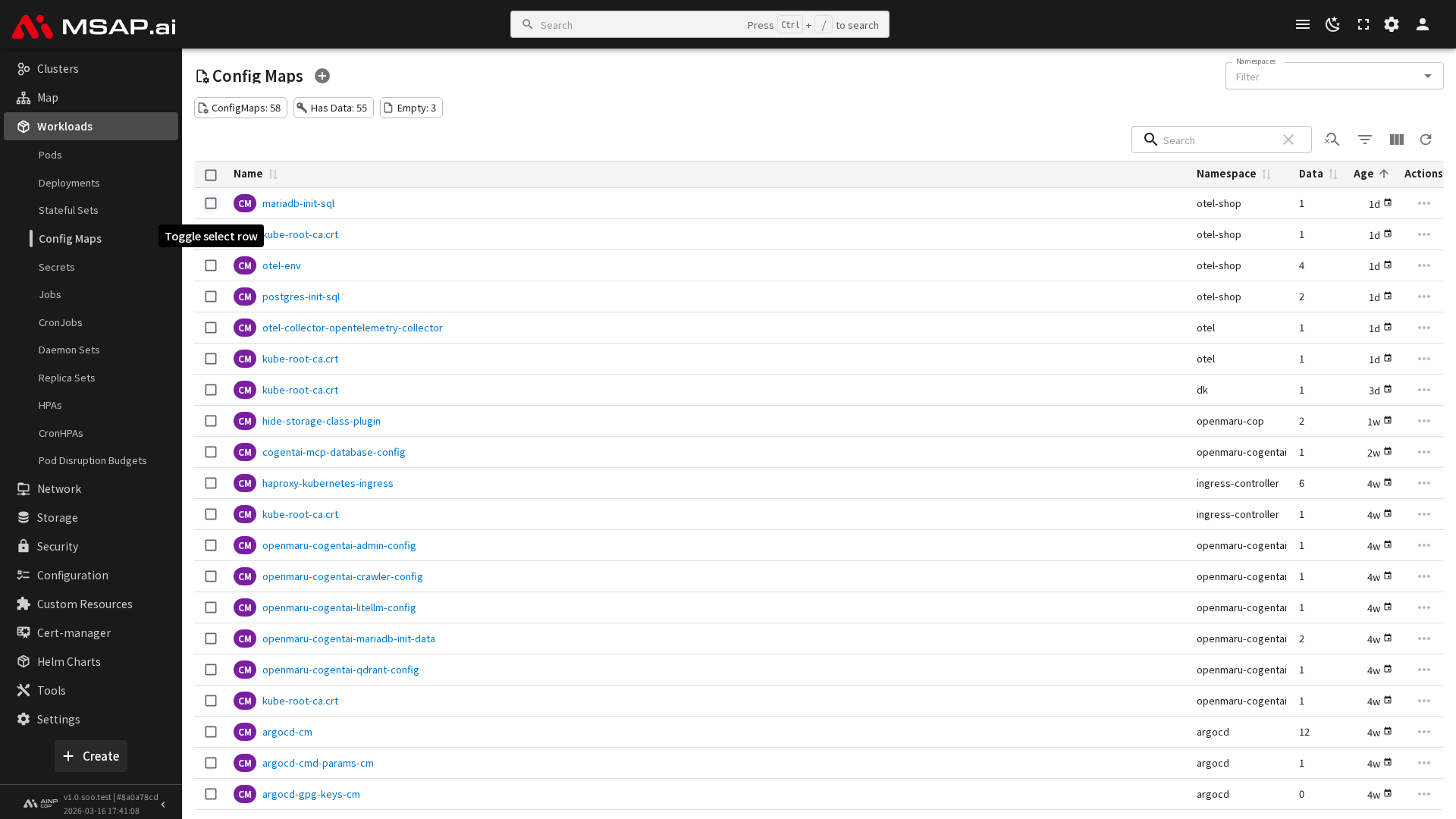 우측 상단의 검색창, 네임스페이스 필터를 사용하여 원하는 Config 맵을 효율적으로 찾을 수 있습니다.