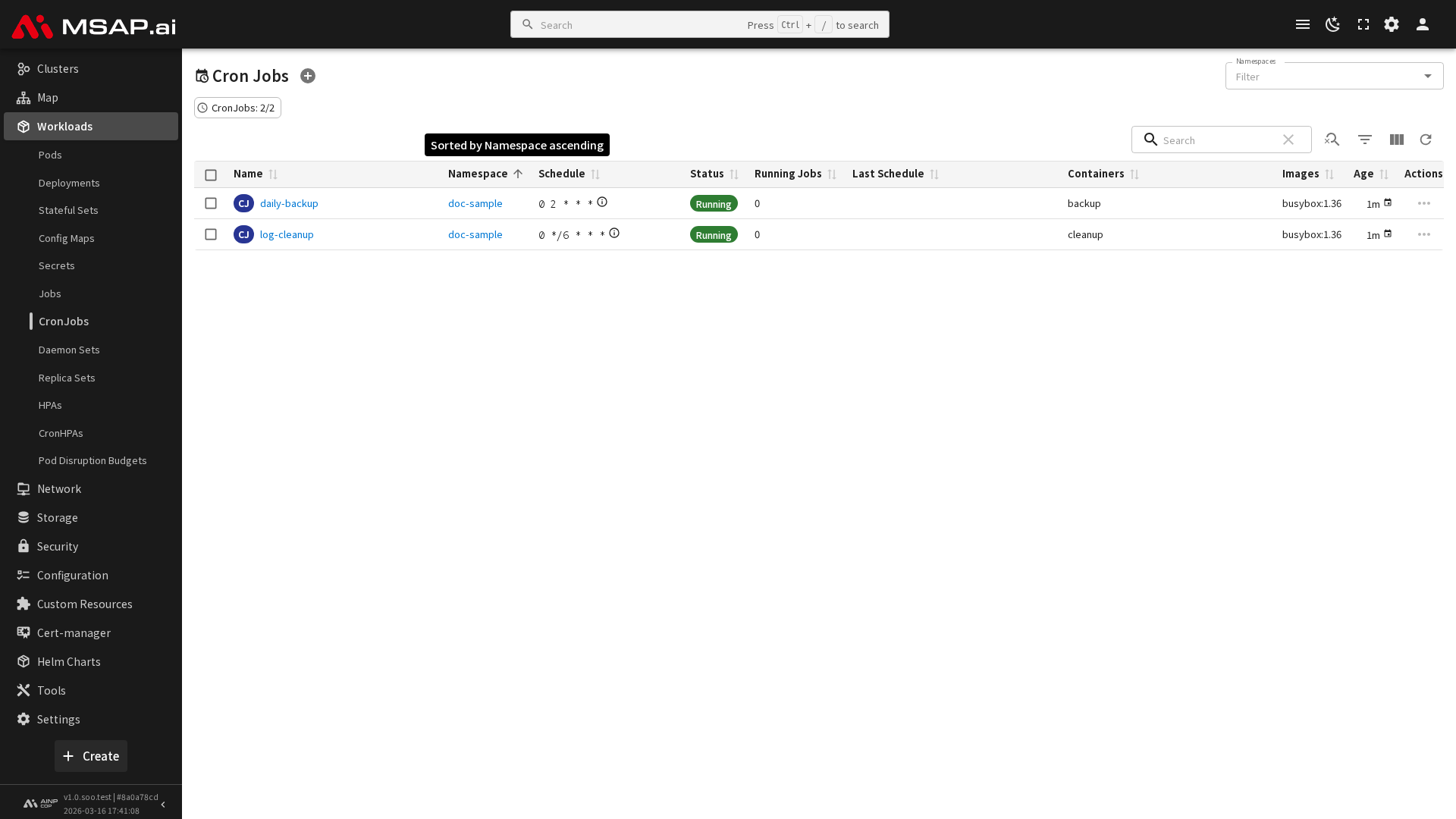 클러스터에 설정된 Cron 작업의 정보가 목록 형태로 표시됩니다.