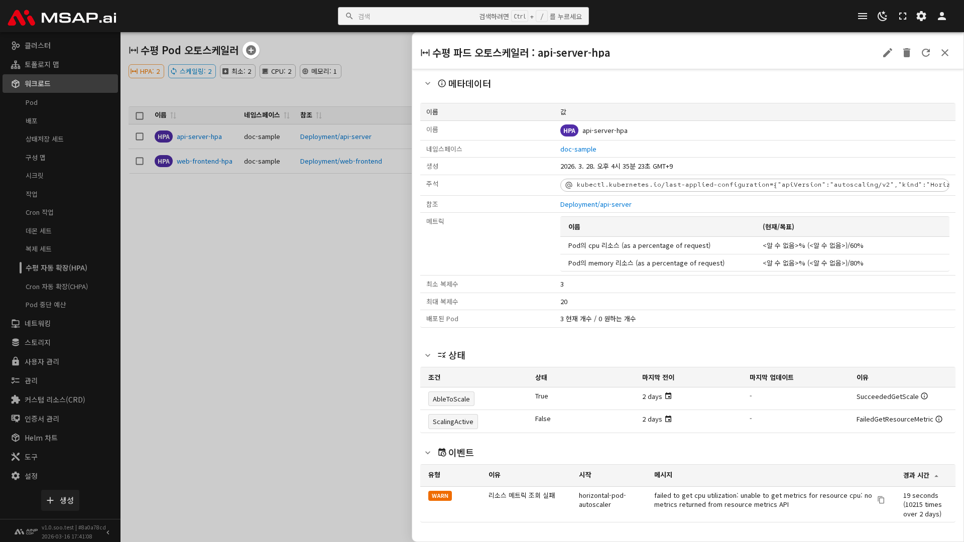 목록에서 특정 HPA의 이름을 클릭하면 상세 상태와 설정을 확인할 수 있는 화면으로 이동합니다.