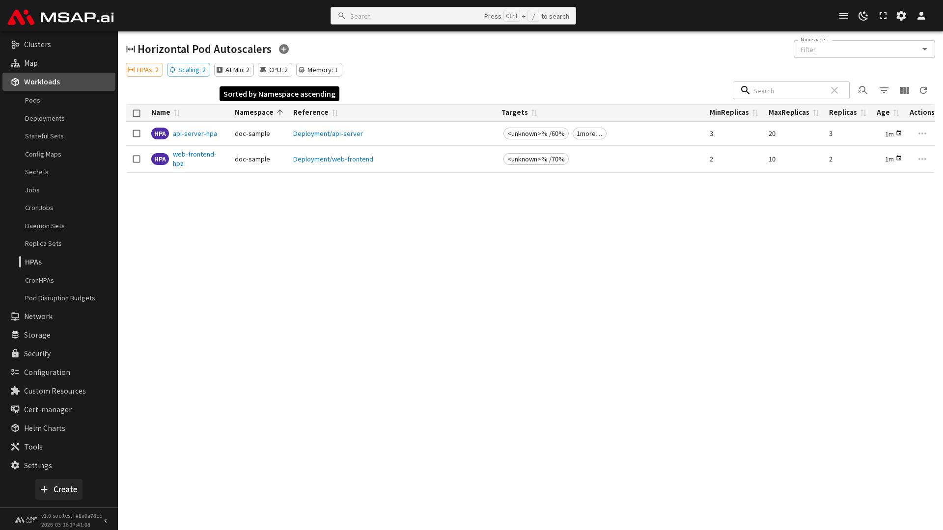 클러스터에 설정된 HPA의 정보가 목록 형태로 표시됩니다.