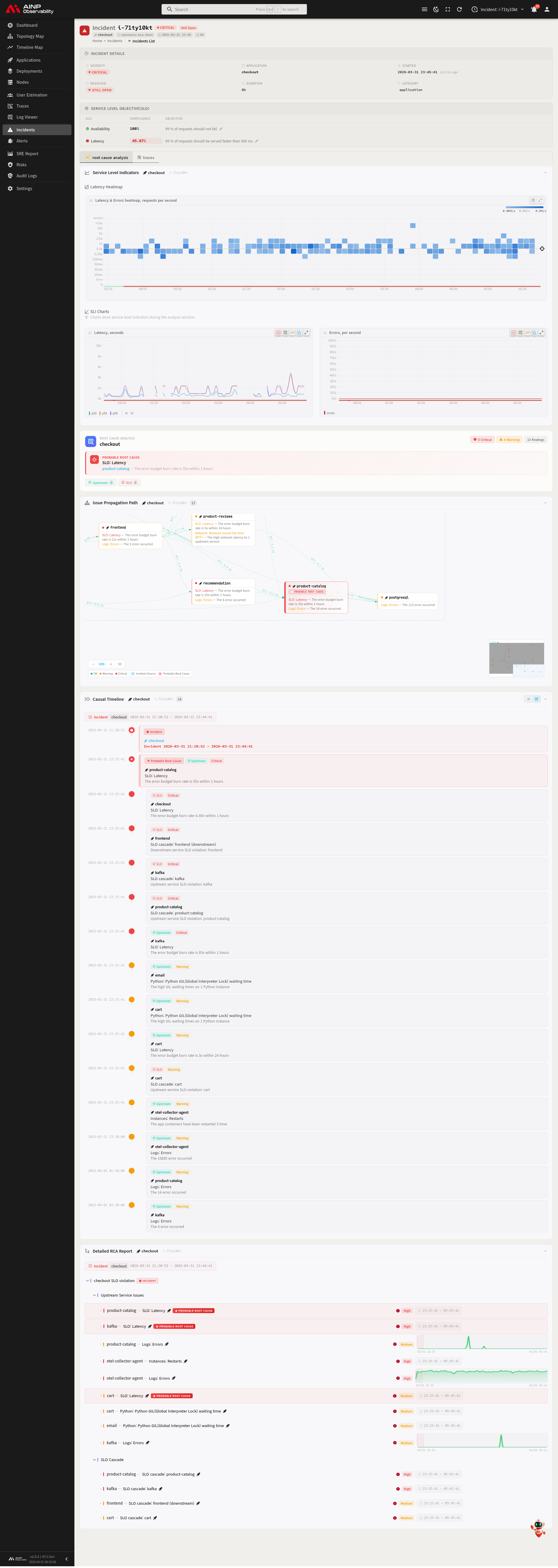 인시던트 발생 시 시스템이 자동으로 원인을 분석하고, 영향 전파 경로와 인과 타임라인을 시각화합니다.