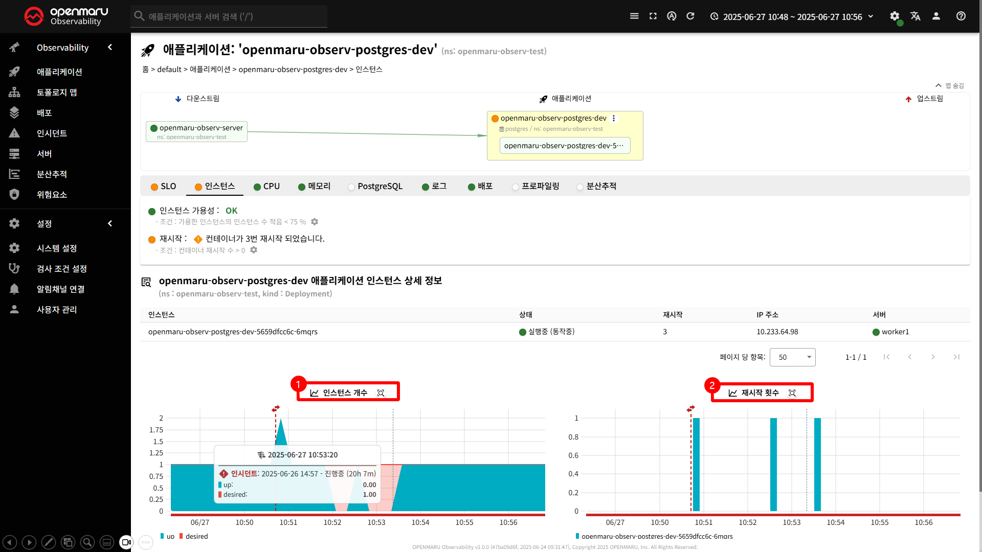 이 탭에서는 애플리케이션의 각 인스턴스별 상태, 가용성, 재시작 횟수 등을 확인할 수 있습니다.