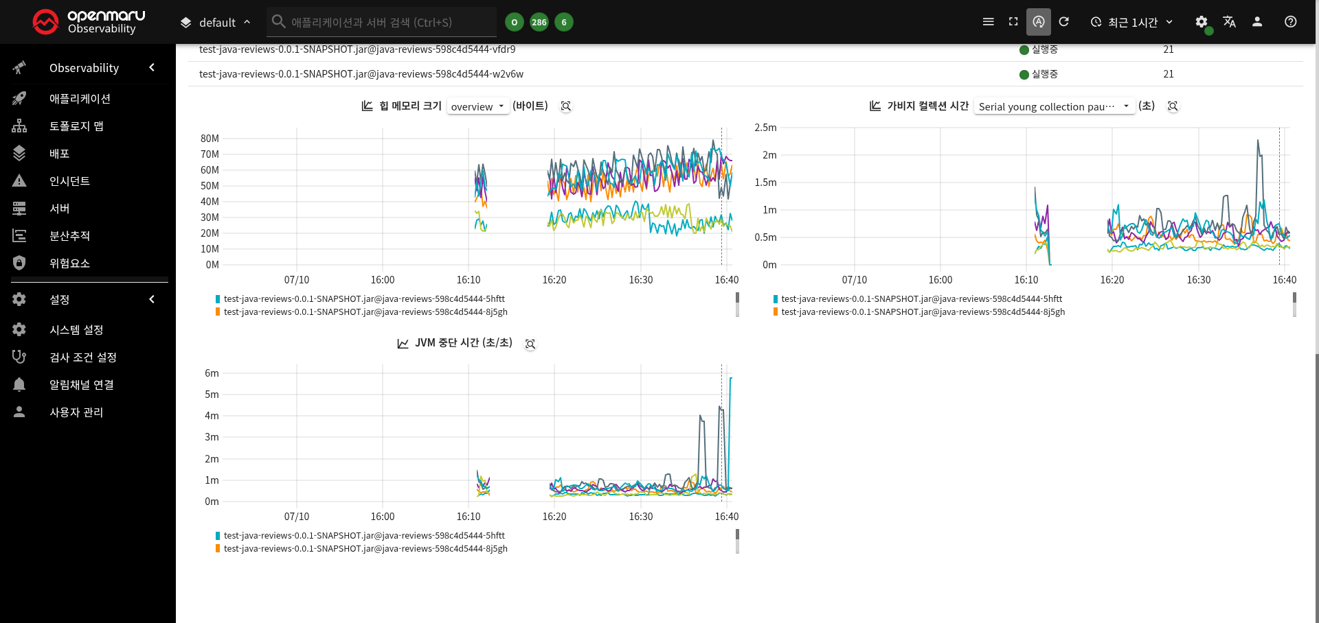 JVM 상태를 관측하고 문제를 조기 진단하기 위한 화면입니다. 아래 대시보드는 주요 JVM 지표(메모리 사용량, GC 시간, JVM 중단 시간 등)를 시각적으로 나타내며, 성능 이상 징후나 리소스 병목 여부를 쉽게 파악할 수 있습니다.