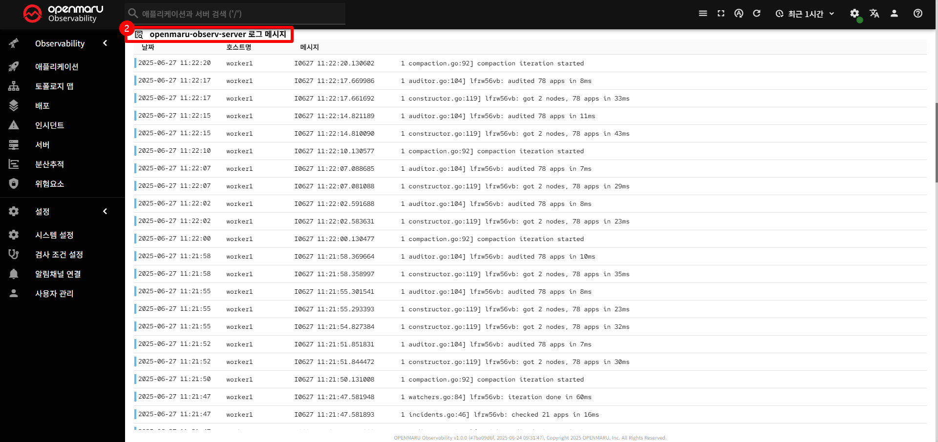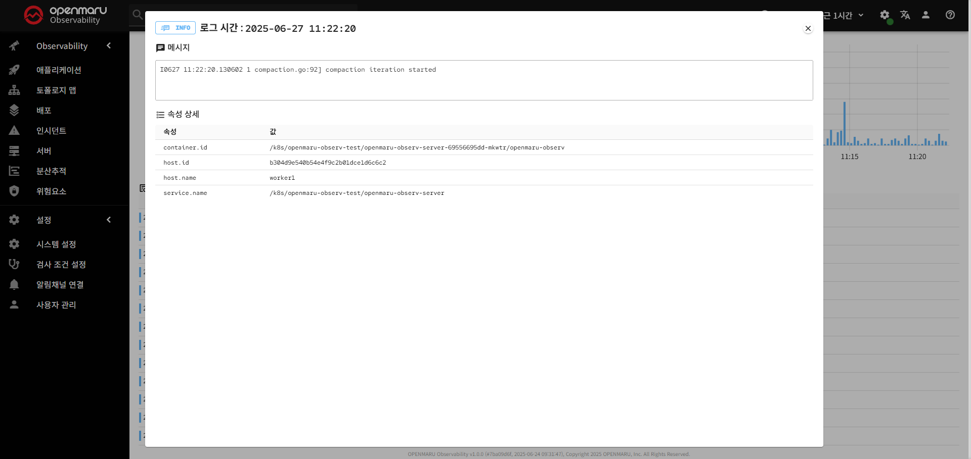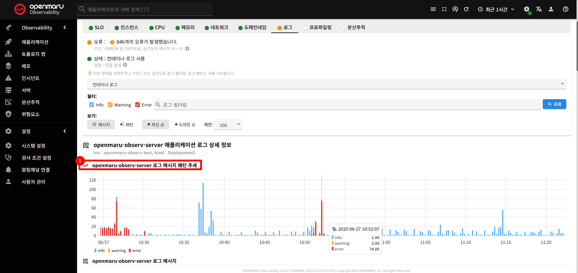 이 탭을 통해 로그 메시지, 로그 패턴, 로그 심각도별 분석 등을 실시간으로 수행하고 문제를 빠르게 진단할 수 있습니다.