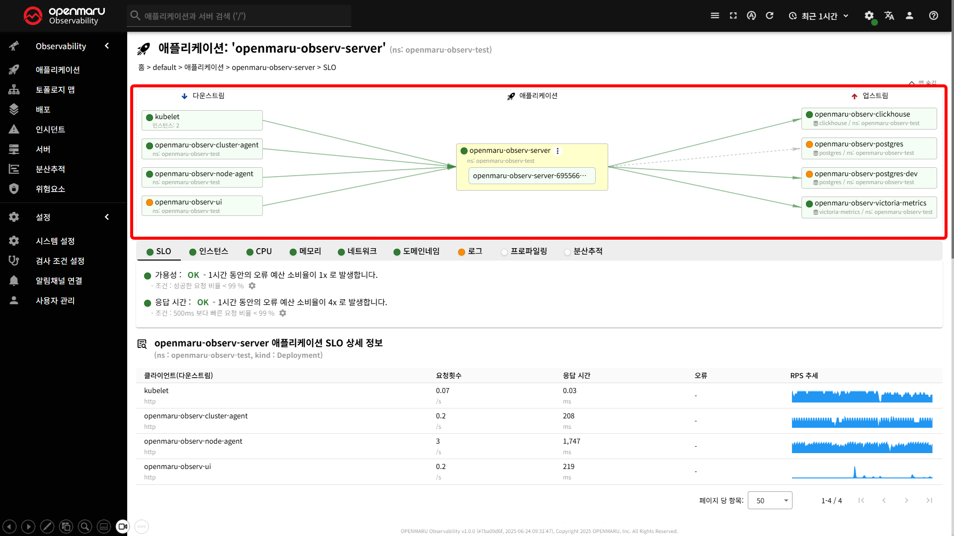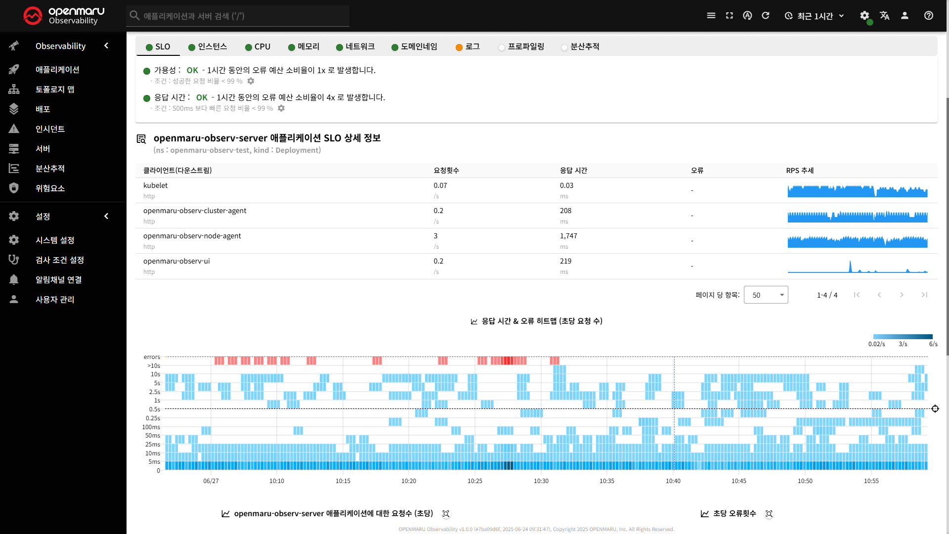 SLO(Service Level Objective) 탭은 애플리케이션의 서비스 수준 목표를 모니터링하고 관리하는 기능을 제공합니다. 이 탭에서는 애플리케이션의 가용성(Availability)과 응답 시간(Latency)에 대한 SLO를 설정하고, 실시간으로 SLO 준수율을 확인할 수 있습니다.