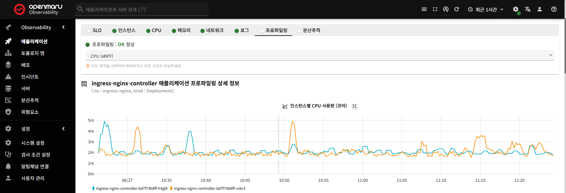 이 탭에서는 노드와 컨테이너 수준의 CPU 사용률, CPU 점유 프로세스, CPU 대기 시간, CPU 스로틀링 등의 상세 한 정보를 확인할 수 있습니다.