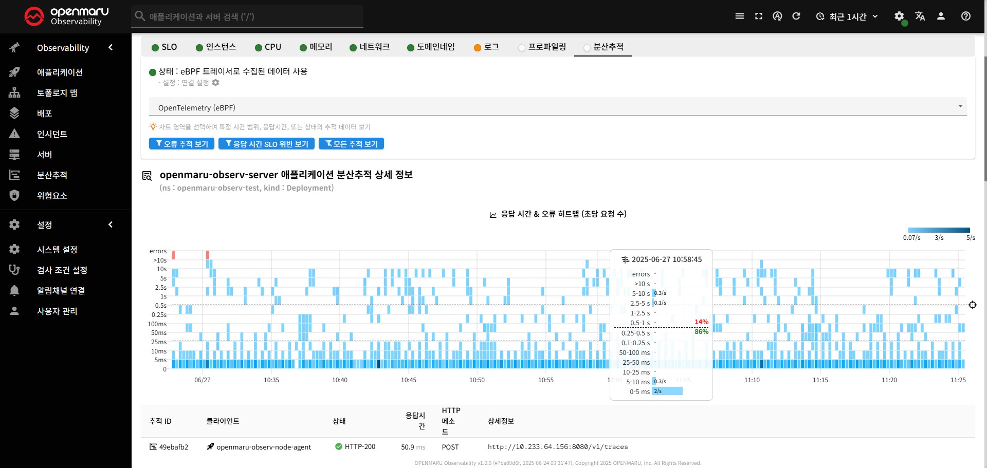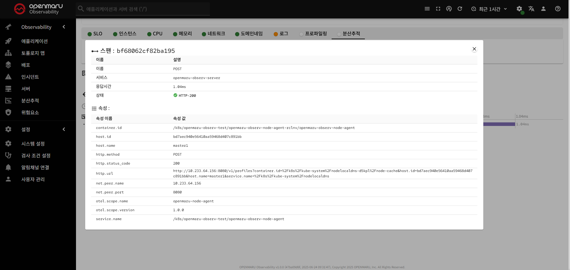 분산 추적 탭은 마이크로서비스 환경에서 요청이 여러 서비스를 거쳐 처리되는 과정을 시각적으로 추적하고 분석할 수 있는 기능을 제공합니다.